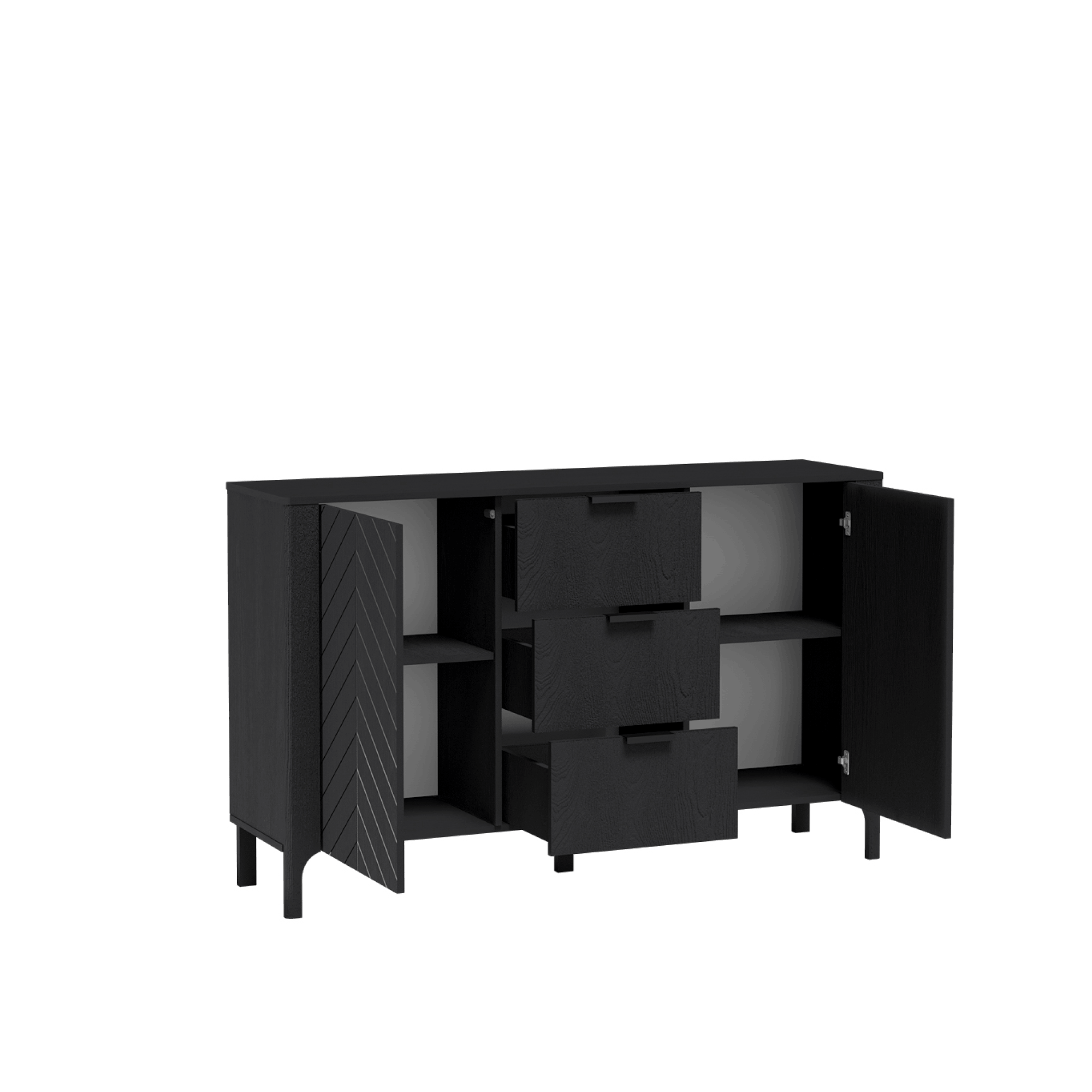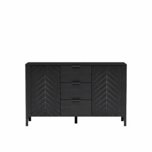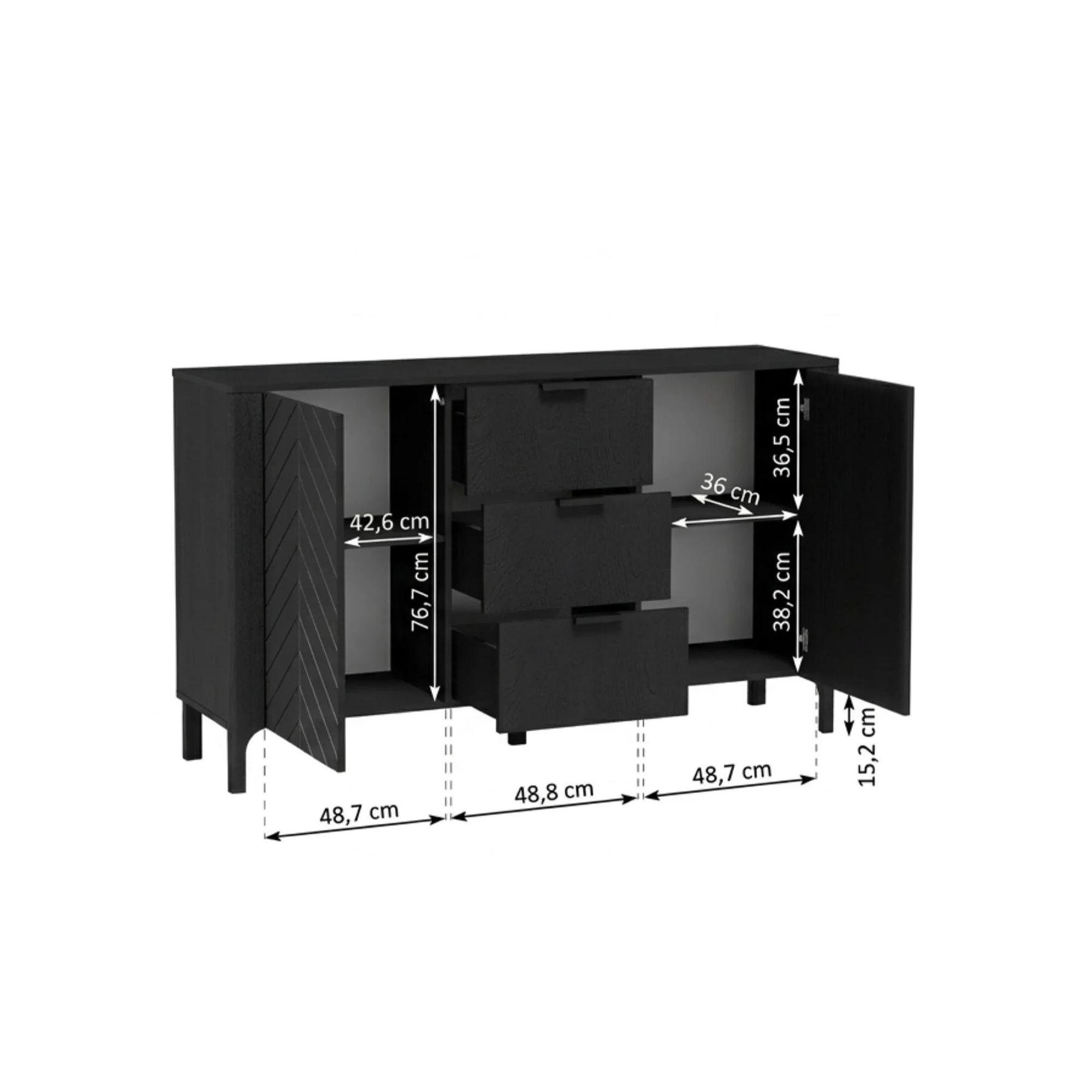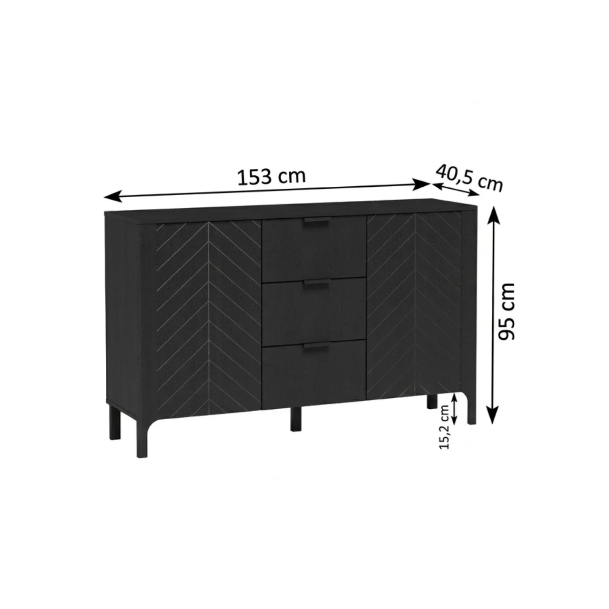 Wyposażona w trzy pojemne szuflady oraz dwie szafki z półkami, zapewnia wygodne miejsce do przechowywania i utrzymania porządku. Fronty z dekoracyjną jodełką oraz minimalistyczne uchwyty podkreślają jej stylowy charakter.