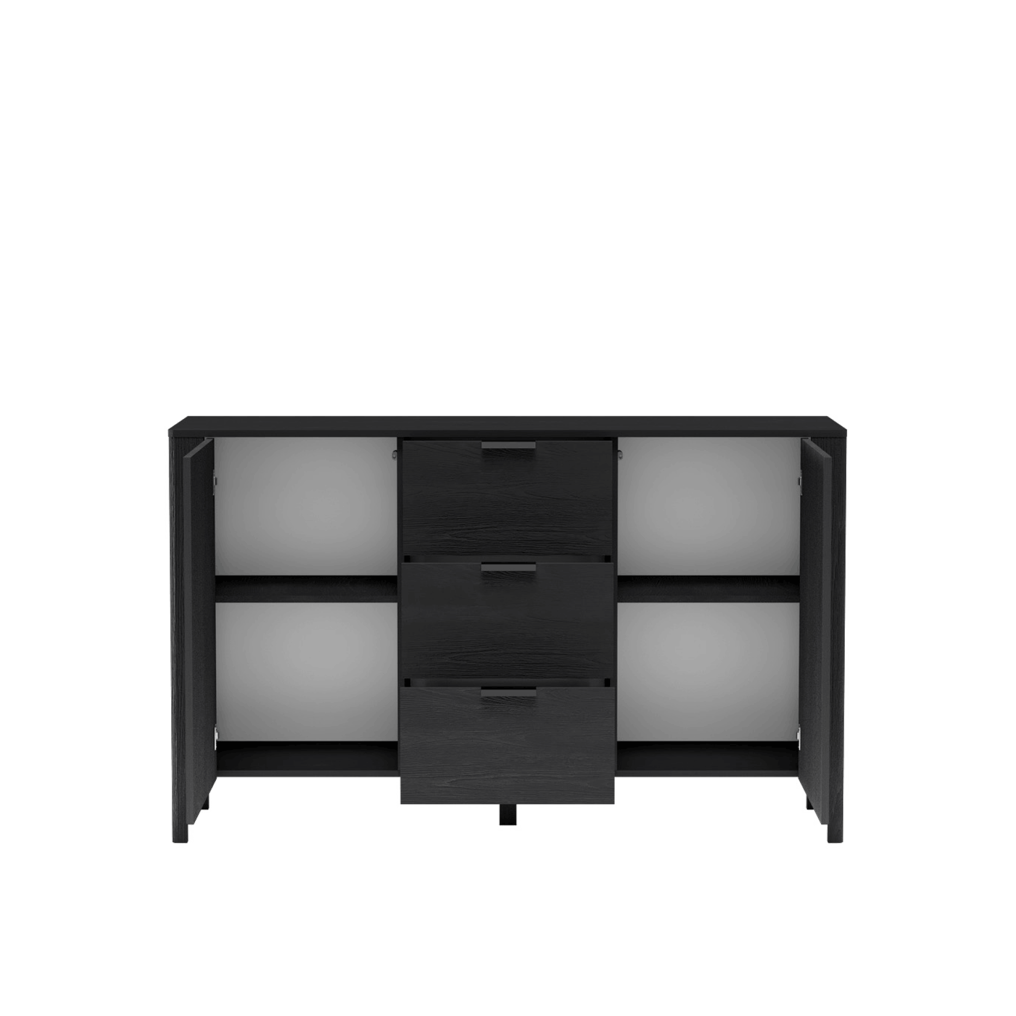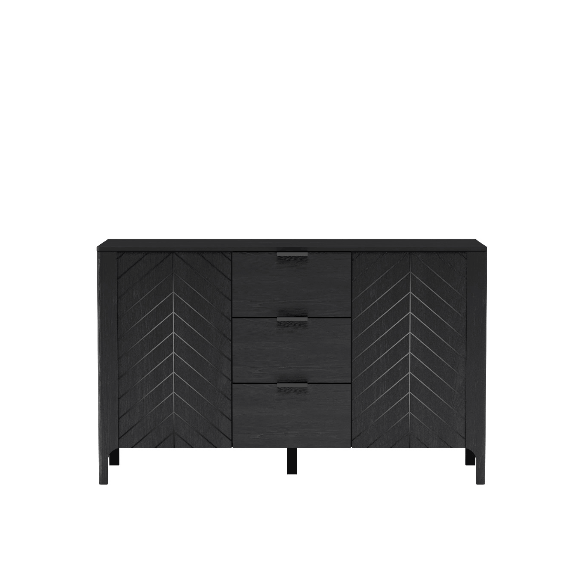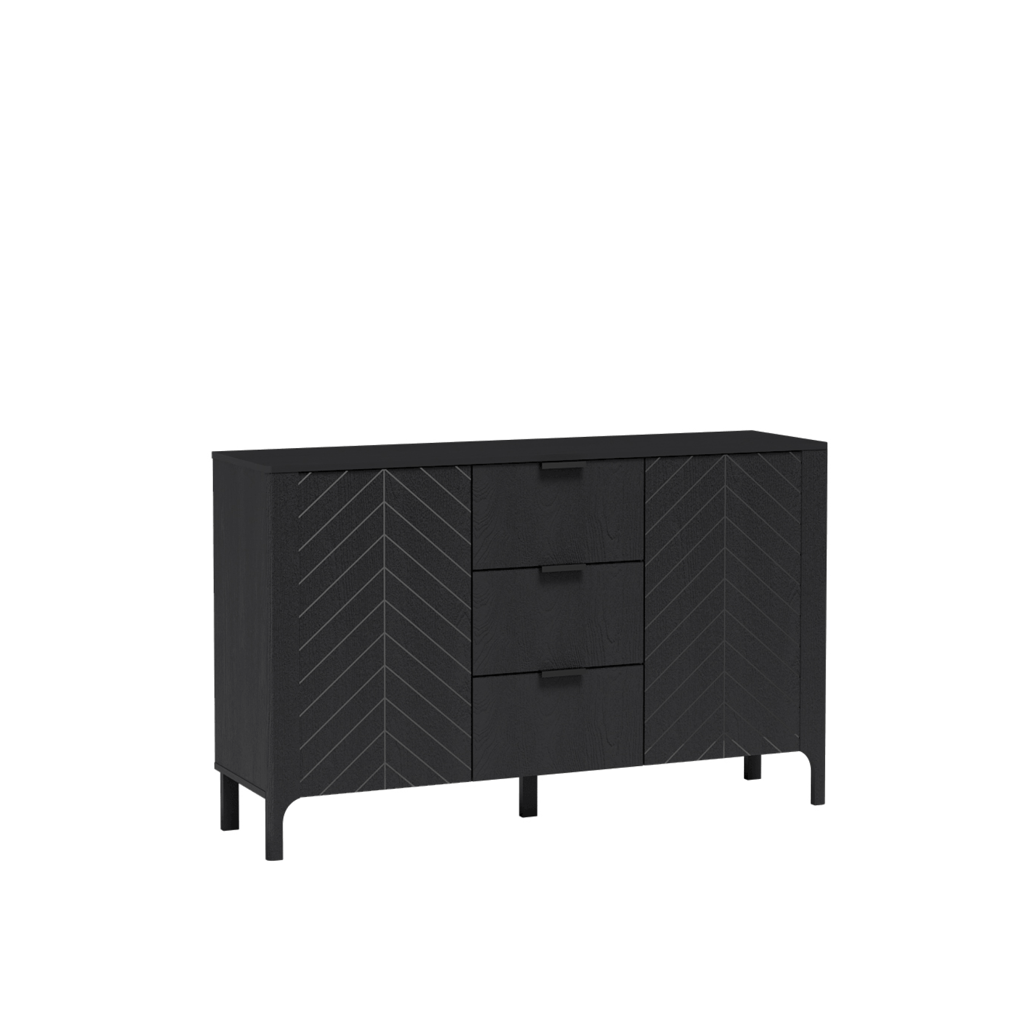 Wyposażona w trzy pojemne szuflady oraz dwie szafki z półkami, zapewnia wygodne miejsce do przechowywania i utrzymania porządku. Fronty z dekoracyjną jodełką oraz minimalistyczne uchwyty podkreślają jej stylowy charakter.