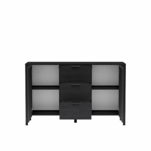 Duża Komoda Montis w głębokim, czarnym kolorze to elegancki i funkcjonalny mebel do nowoczesnych wnętrz.