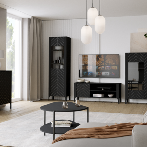 Meble wyróżniają się delikatnym wzorem jodełki na frontach oraz smukłymi nóżkami, które nadają bryłom lekkości i nowoczesnego charakteru. Dzięki temu całość prezentuje się elegancko, a jednocześnie nie przytłacza wnętrza.