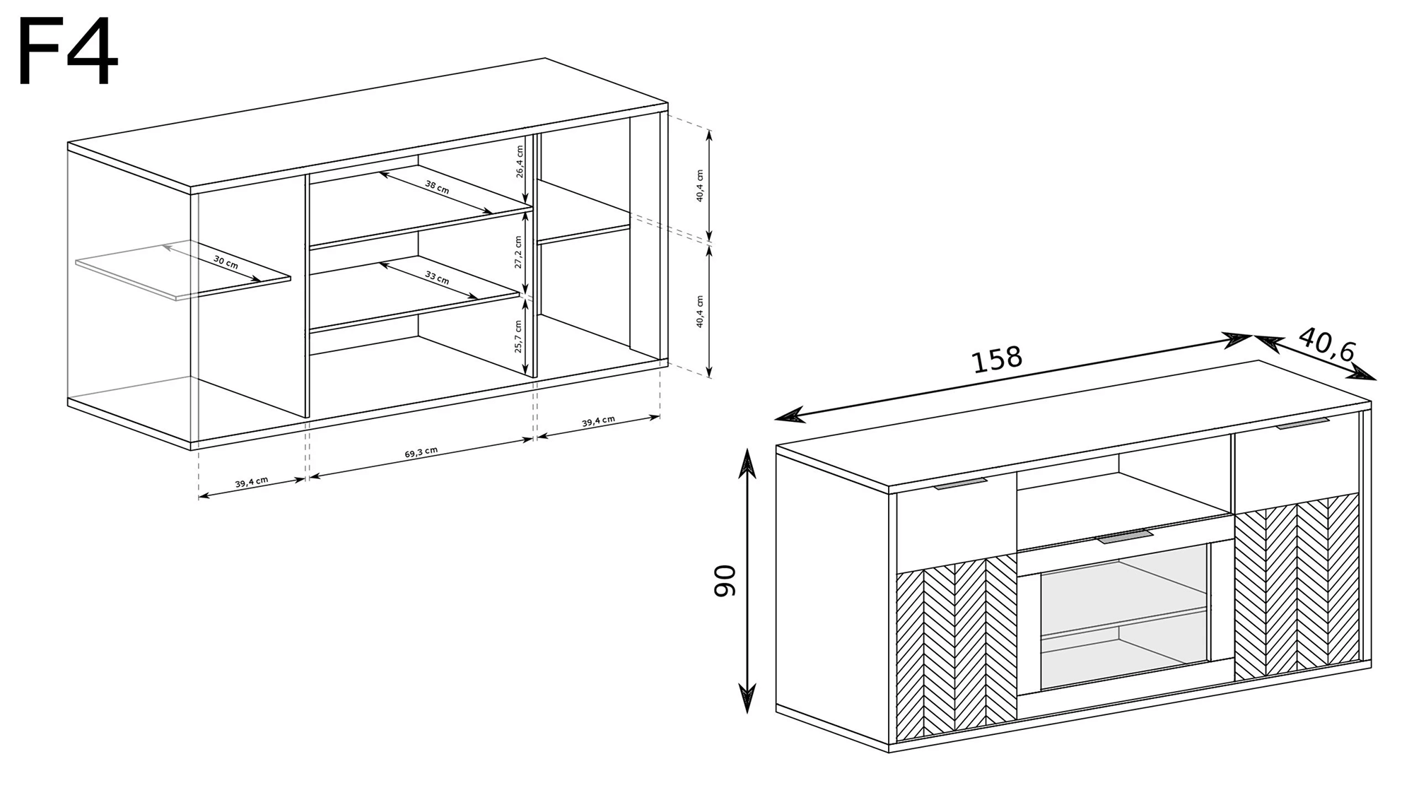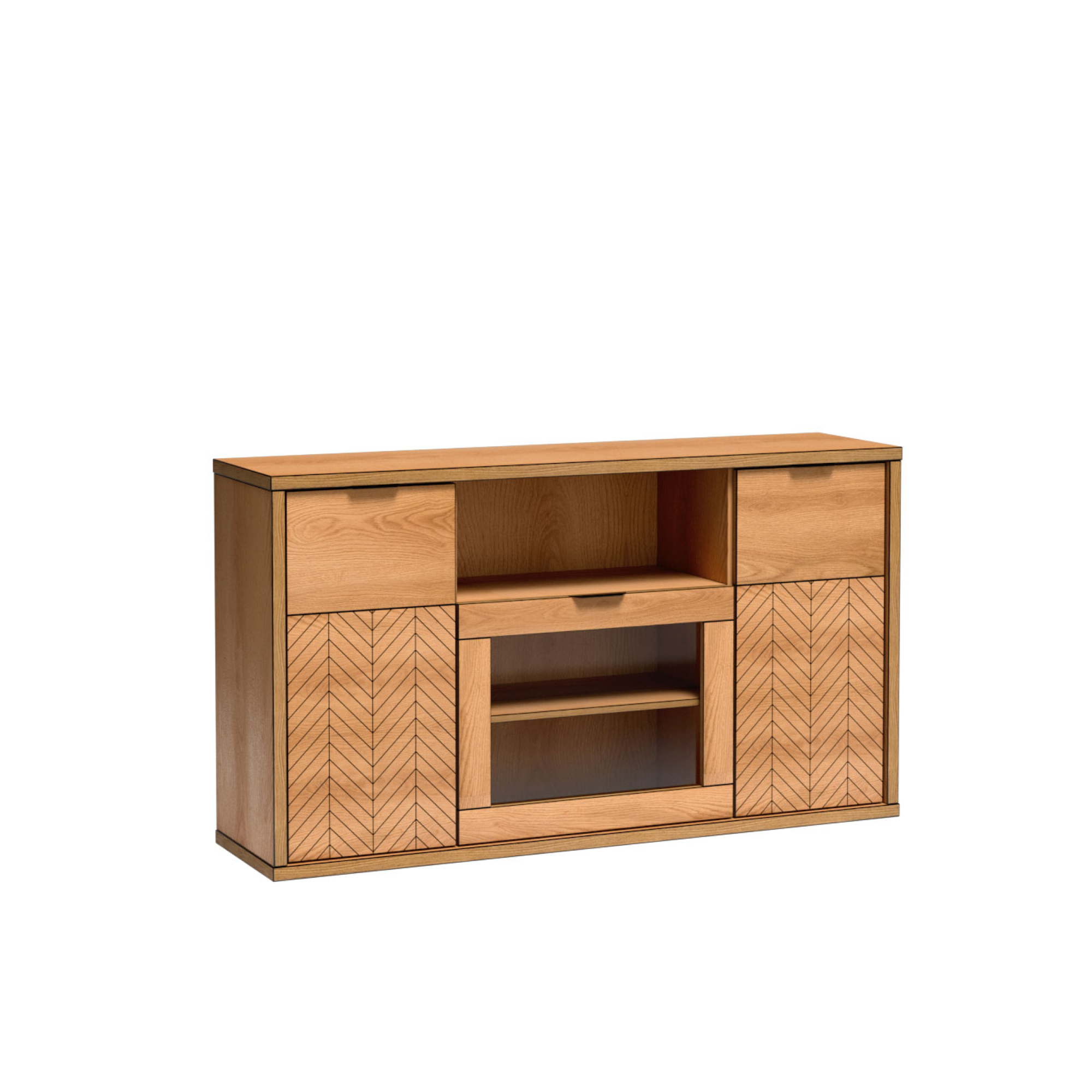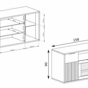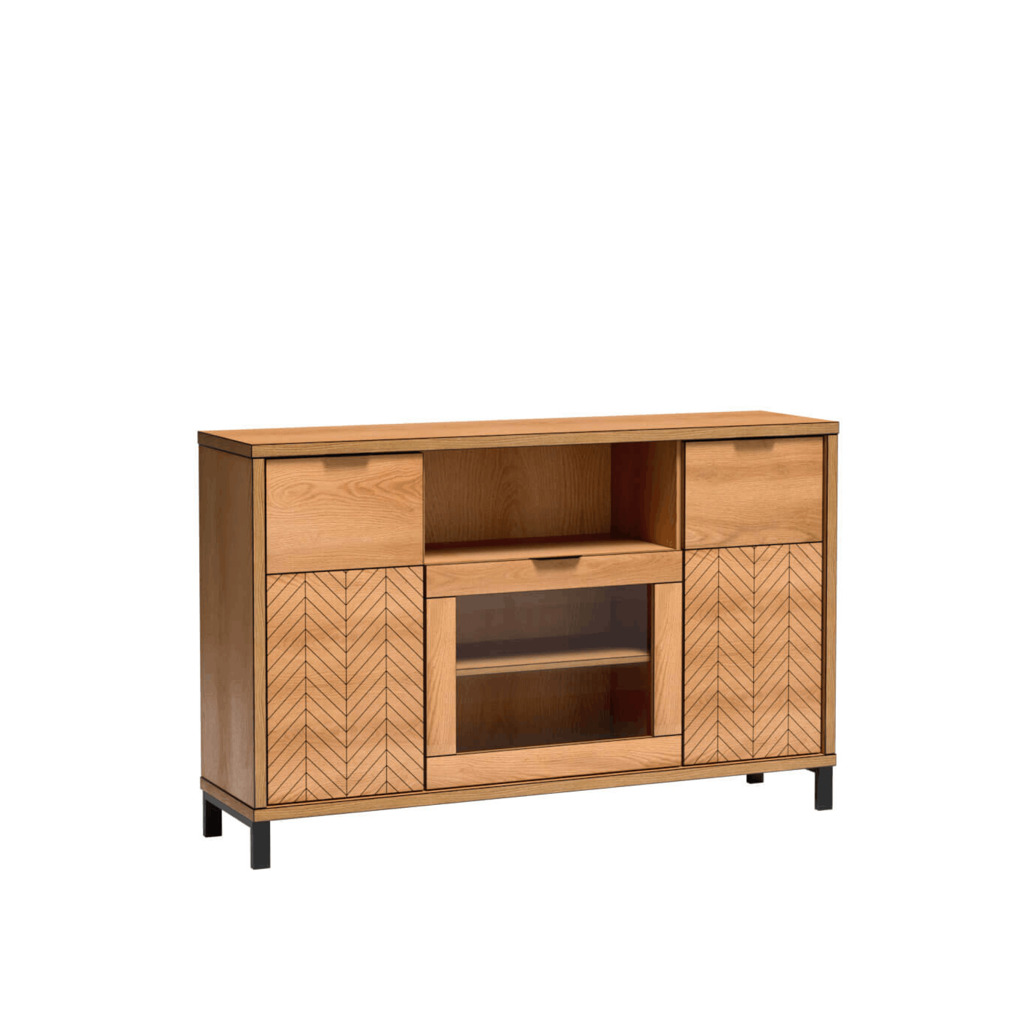 Fronty zdobione czarną jodełką oraz matowe uchwyty podkreślają nowoczesny design. Proste, geometryczne bryły sprawiają, że meble doskonale pasują do salonu, sypialni i jadalni.