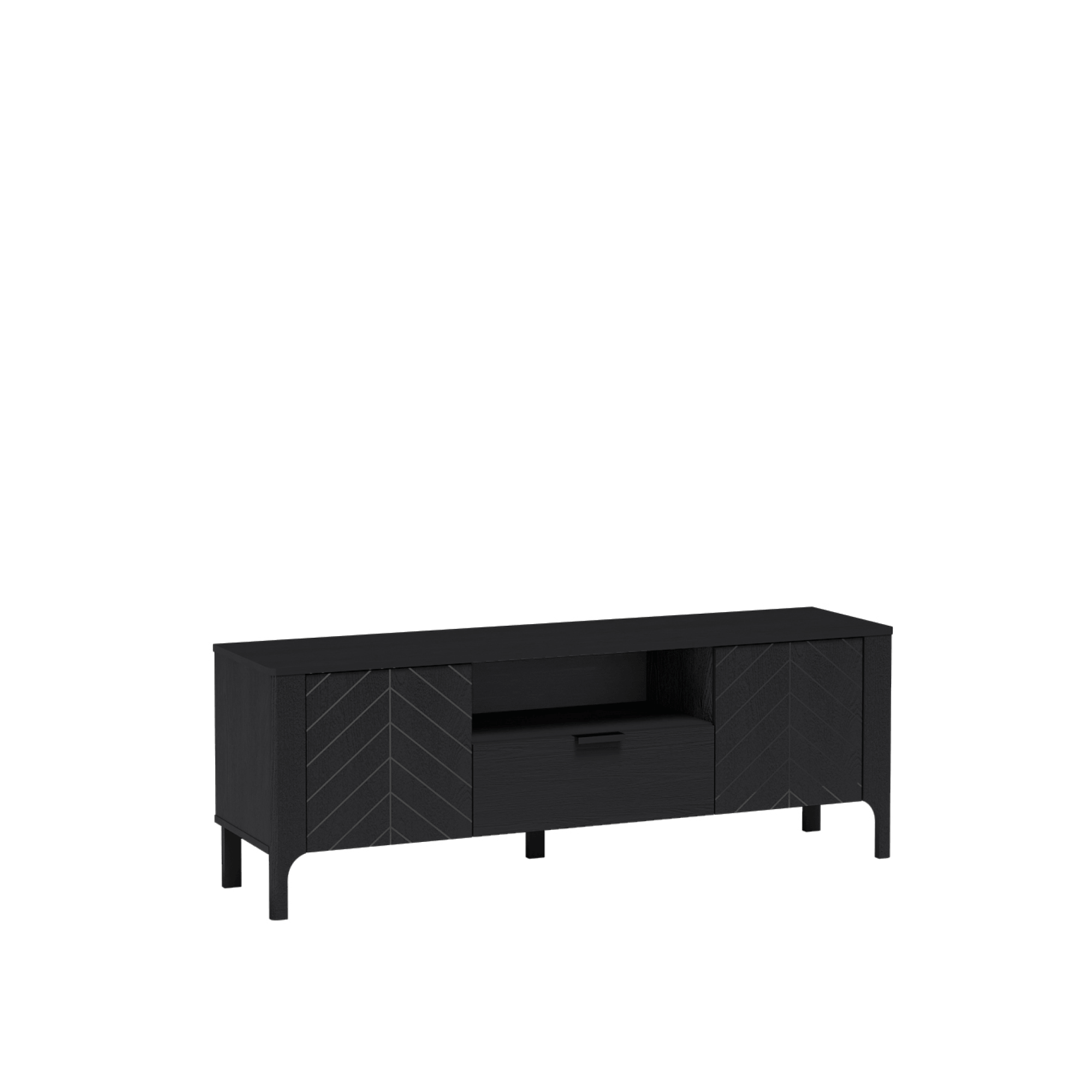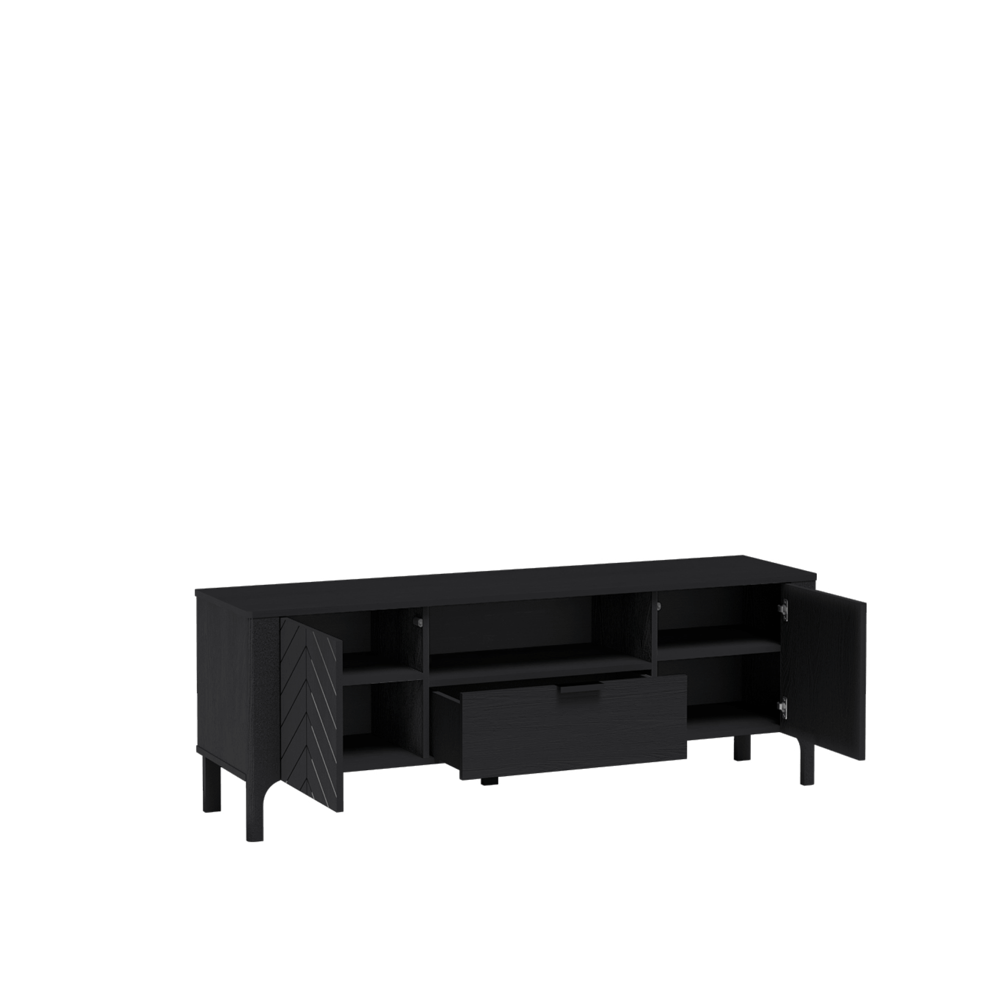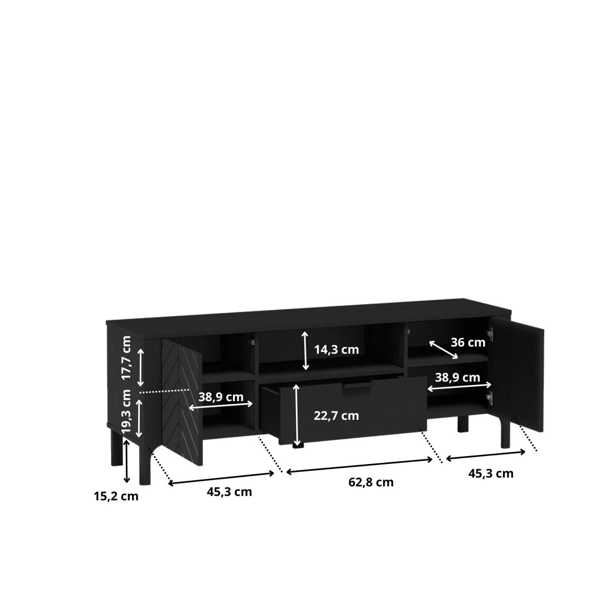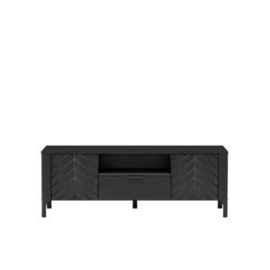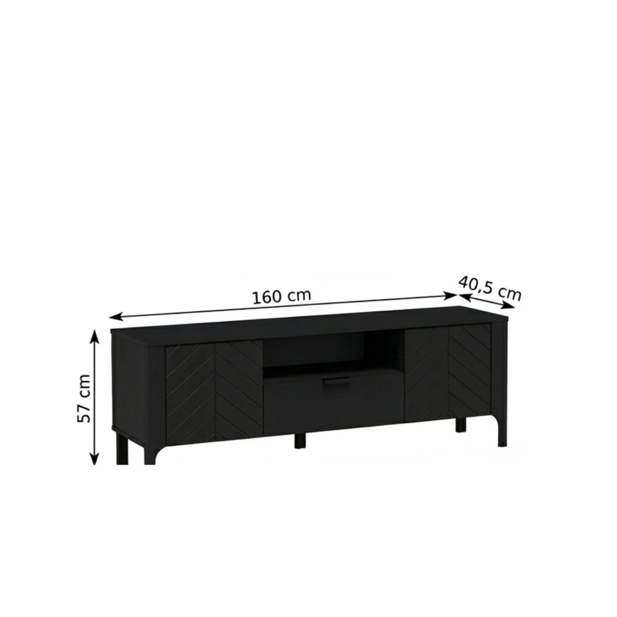 Wyposażona w dwie zamykane szafki z półkami, centralną szufladę oraz otwartą przestrzeń na sprzęt RTV, zapewnia wygodne miejsce do przechowywania i organizacji. Fronty z dekoracyjną jodełką podkreślają elegancki charakter mebla. Stabilne nóżki i solidne wykonanie sprawiają, że szafka doskonale łączy styl z codzienną funkcjonalnością.
