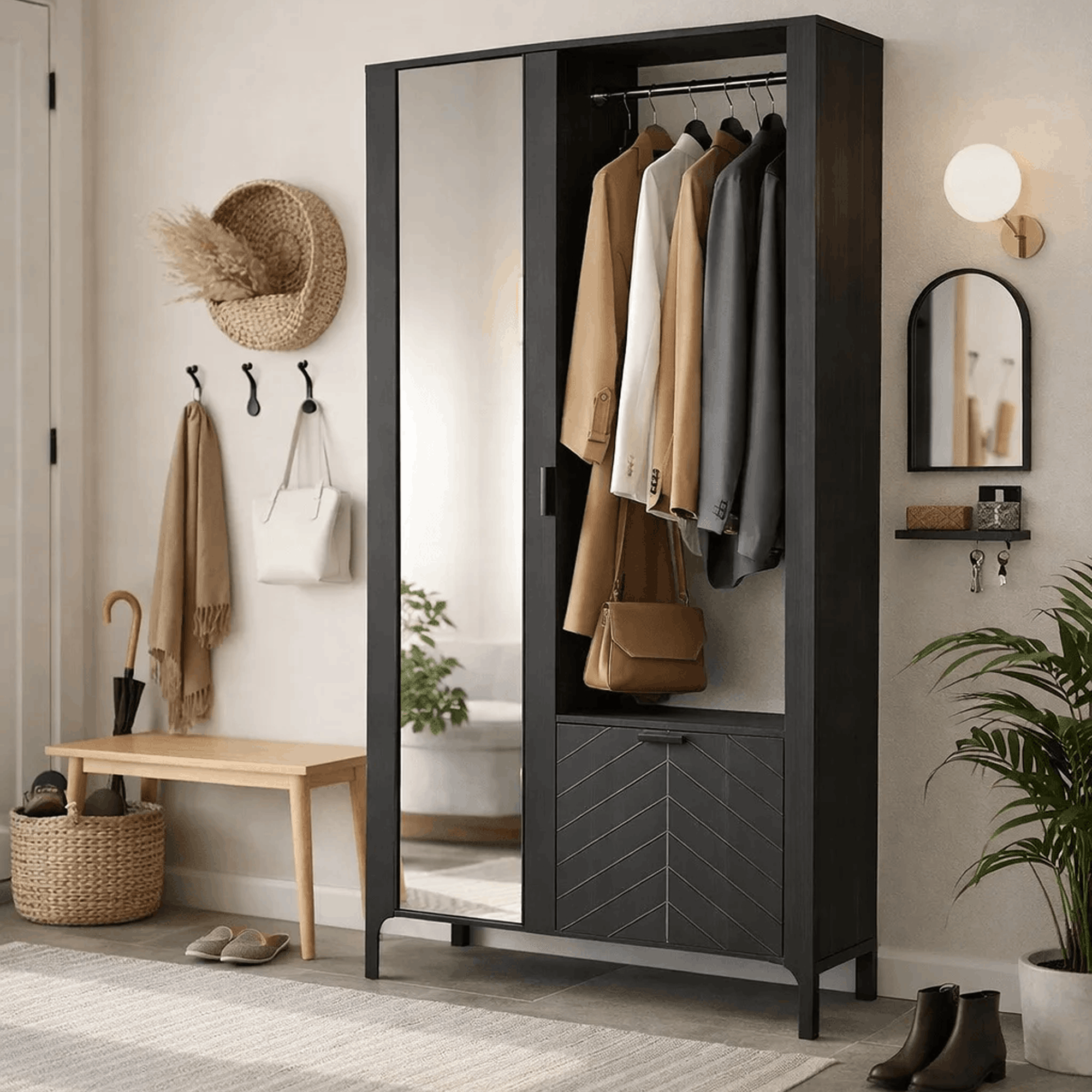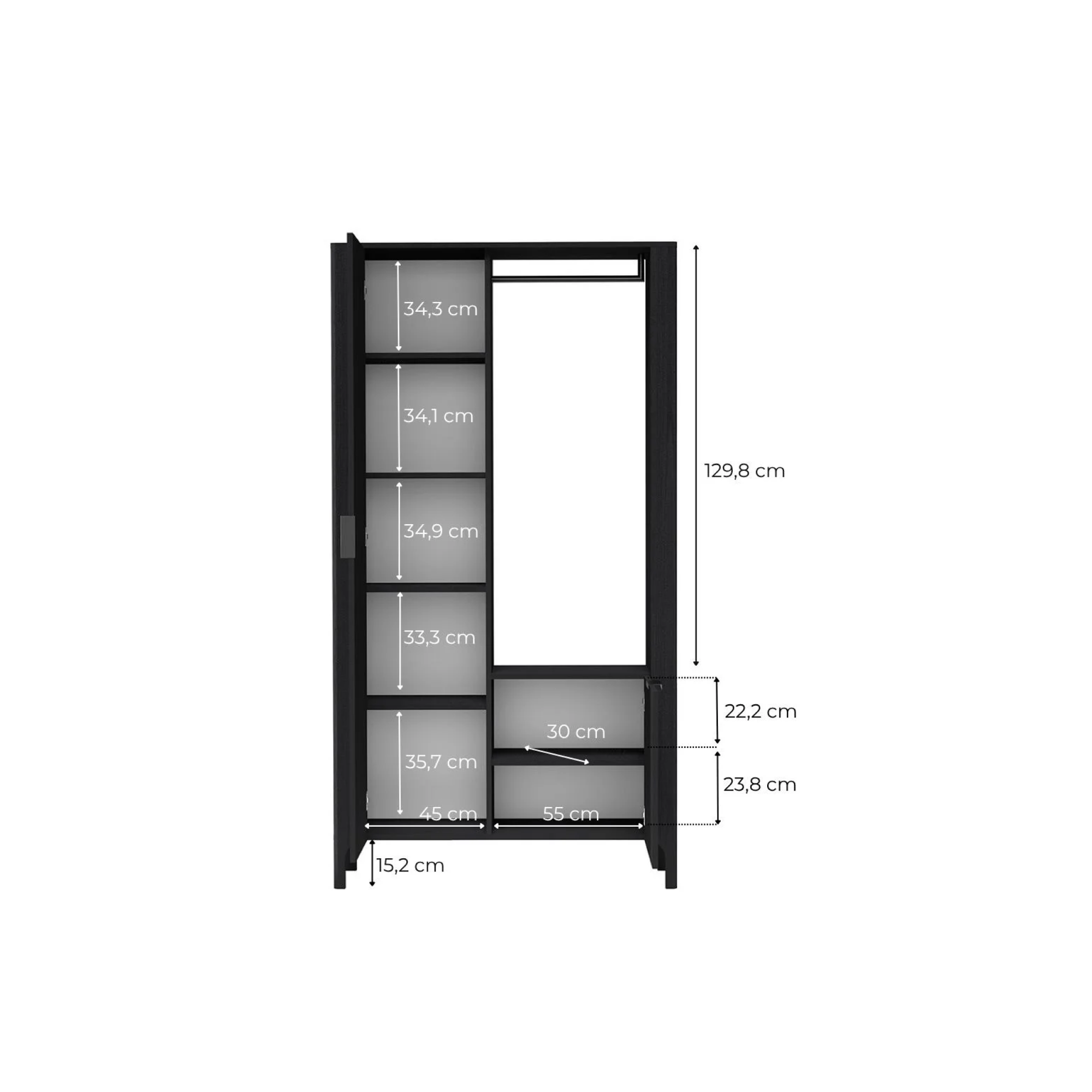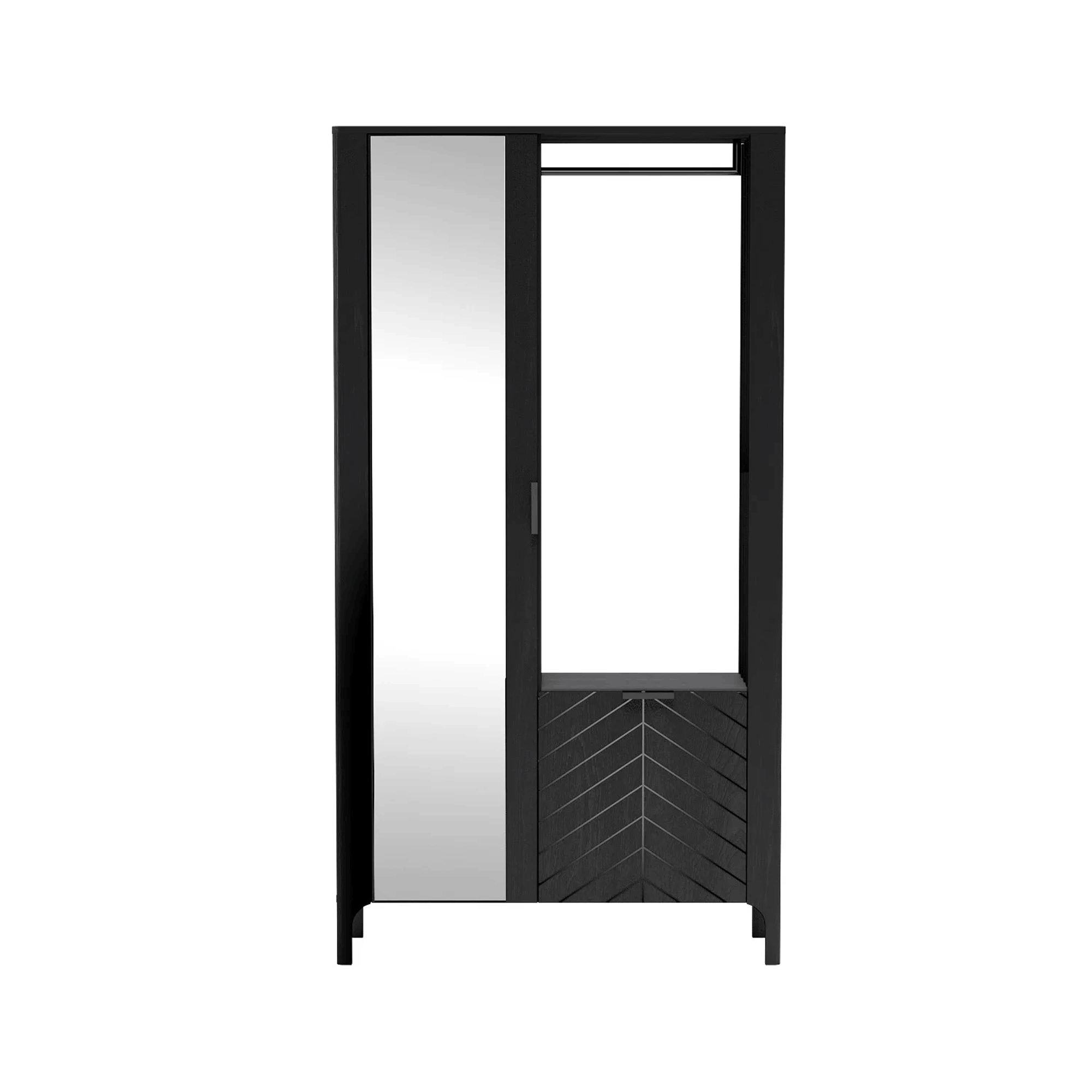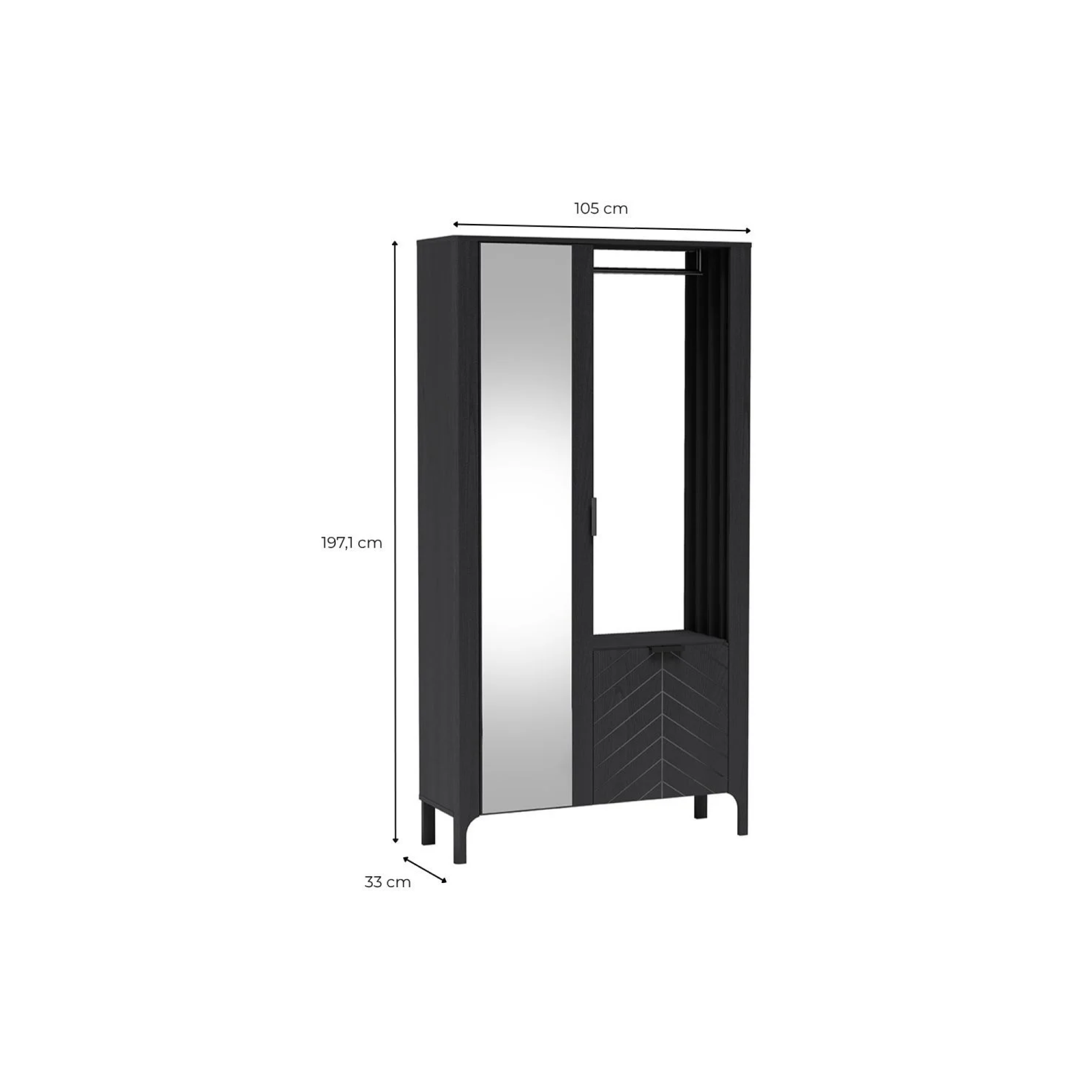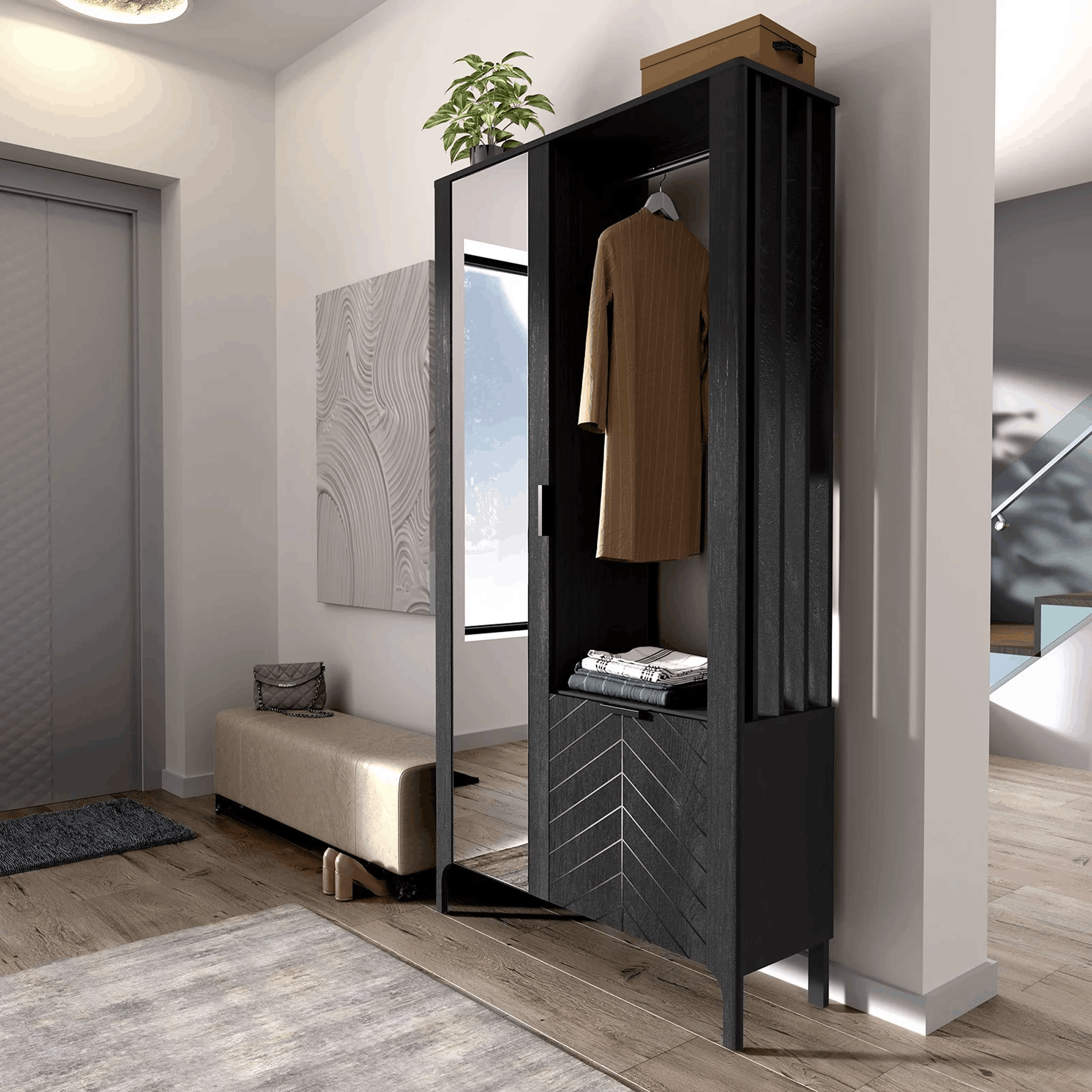 Wyposażona w wysokie lustro, otwartą część z drążkiem na ubrania oraz dolną szafkę na buty i akcesoria, ułatwia codzienną organizację. Minimalistyczny design i praktyczny układ sprawiają, że garderoba doskonale łączy styl z wygodą użytkowania.