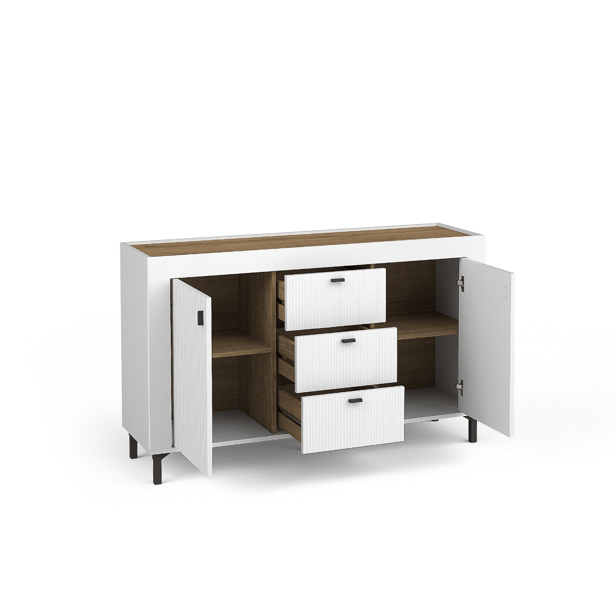 Kolekcja Naro to nowoczesna linia mebli, która wyróżnia się eleganckim designem i wysoką funkcjonalnością, idealnie pasującą do salonu, pokoju dziennego czy sypialni. Charakterystycznym elementem tej kolekcji są wysokie nóżki, gustowne uchwyty oraz proste, masywne bryły dostępne w kolorze bieli, czerni i kaszmiru, wzbogacone o akcenty w odcieniu dębu wiskey. Efekt 3D, nadawany przez prążkowane fronty, podkreśla nowoczesność i styl mebli. Bogaty wybór elementów, takich jak komody, witryny, szafy, regały, ławy, stoliki nocne oraz szafki RTV, pozwala na indywidualne aranżacje wnętrz, dostosowane do potrzeb każdego pomieszczenia.