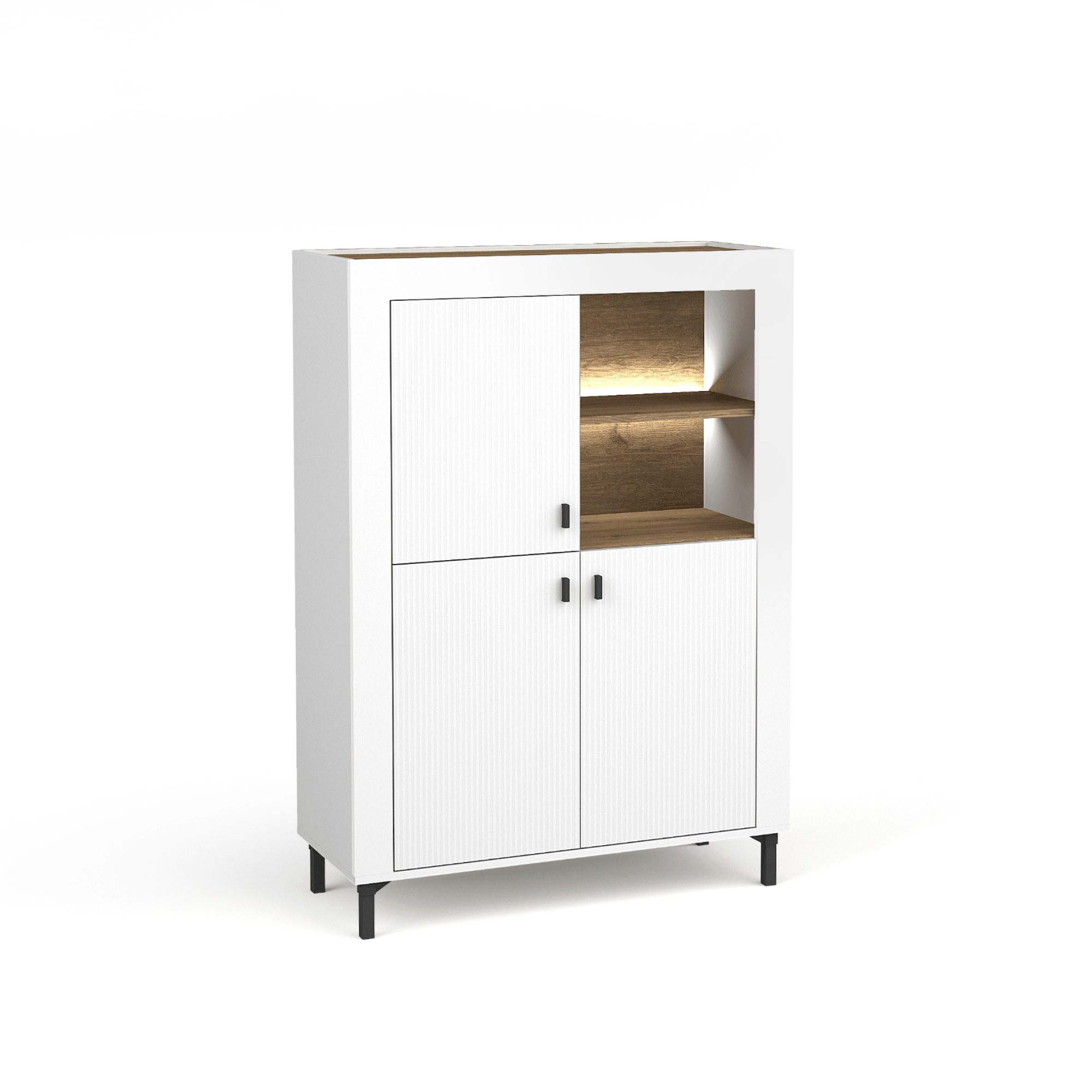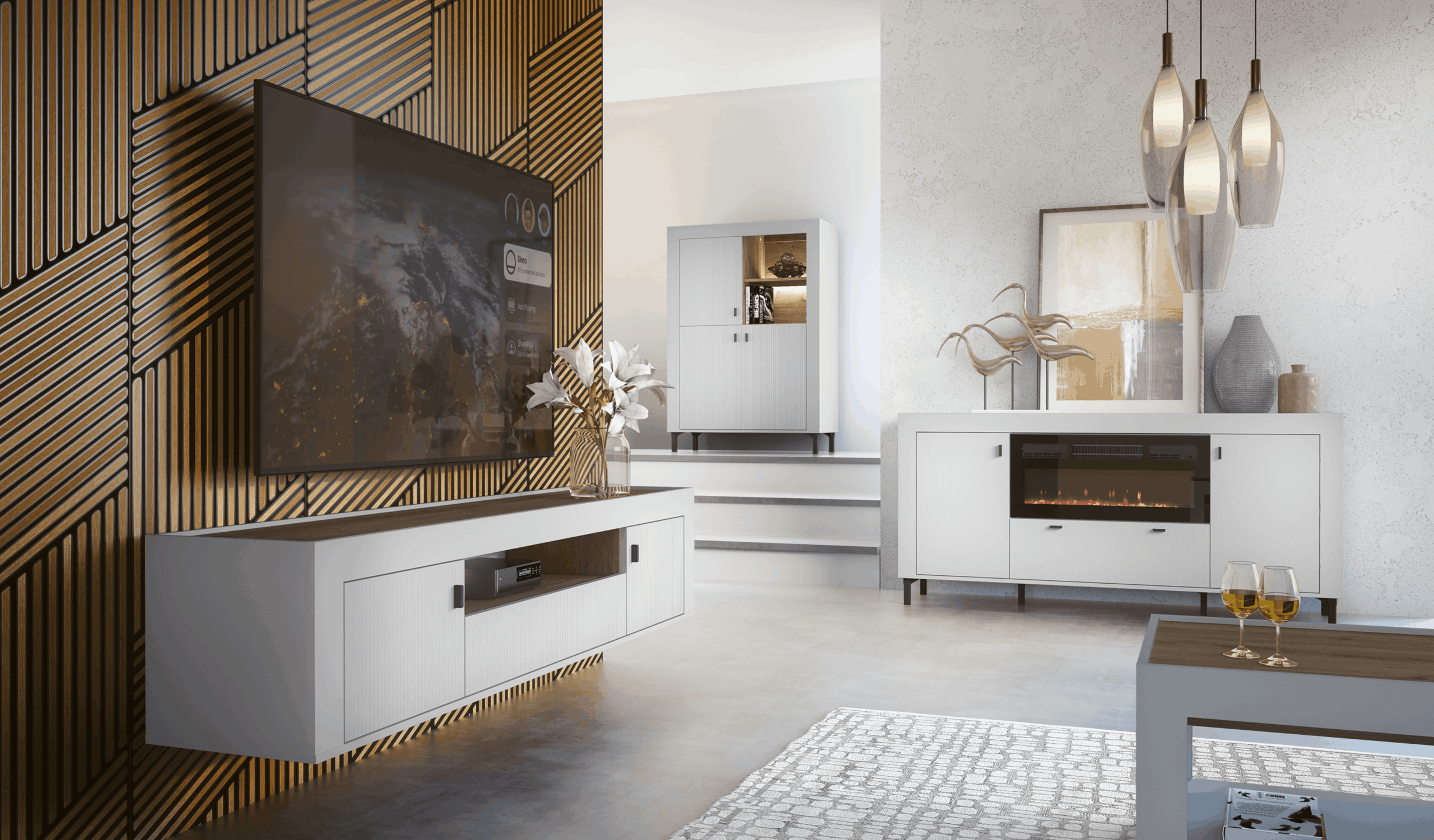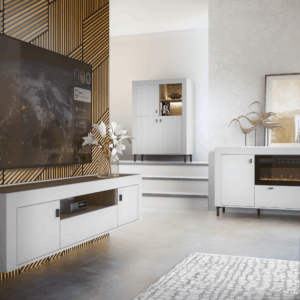 Kolekcja Naro to nowoczesna linia mebli, która wyróżnia się eleganckim designem i wysoką funkcjonalnością, idealnie pasującą do salonu, pokoju dziennego czy sypialni. Charakterystycznym elementem tej kolekcji są wysokie nóżki, gustowne uchwyty oraz proste, masywne bryły dostępne w kolorze bieli, czerni i kaszmiru, wzbogacone o akcenty w odcieniu dębu wiskey. Efekt 3D, nadawany przez prążkowane fronty, podkreśla nowoczesność i styl mebli. Bogaty wybór elementów, takich jak komody, witryny, szafy, regały, ławy, stoliki nocne oraz szafki RTV, pozwala na indywidualne aranżacje wnętrz, dostosowane do potrzeb każdego pomieszczenia.