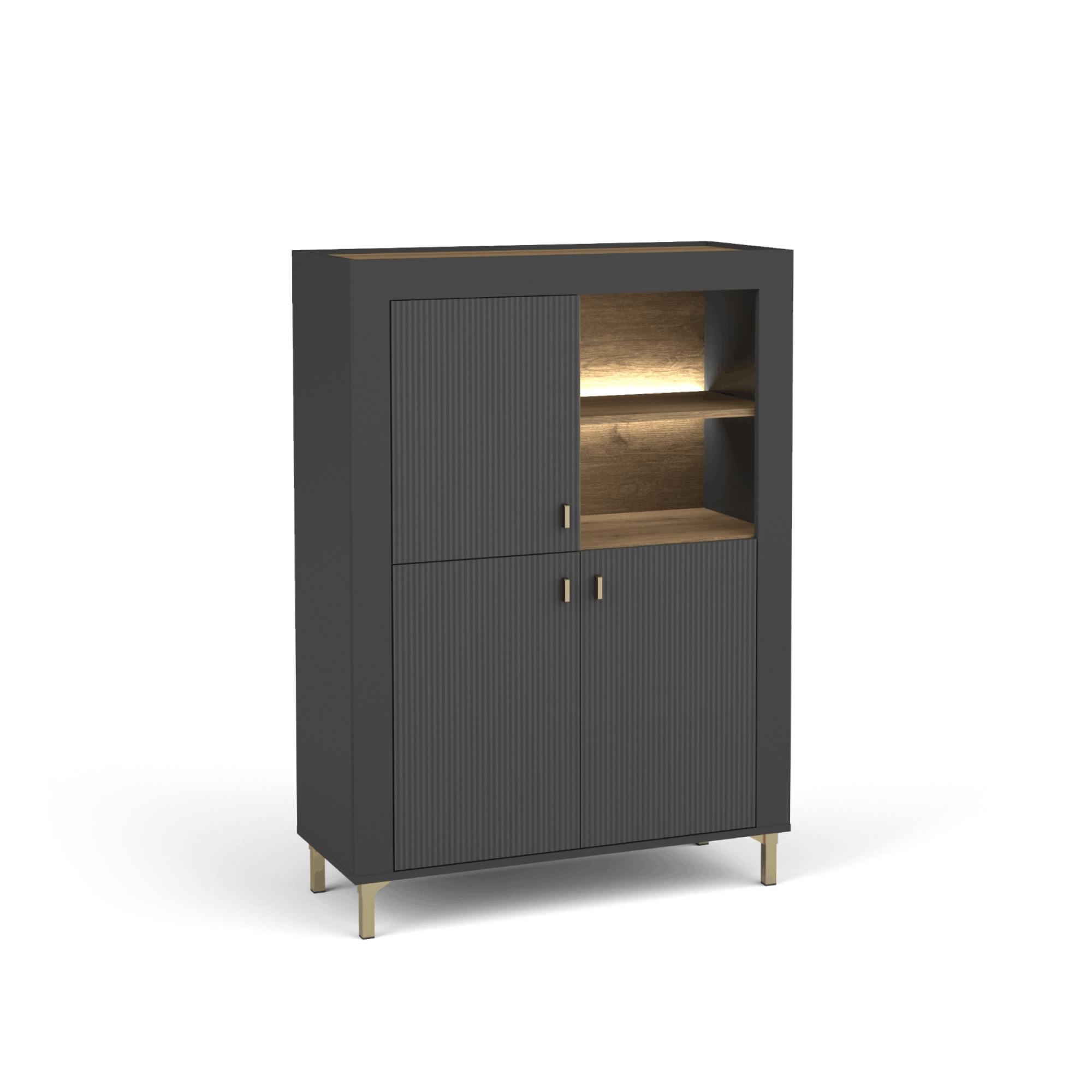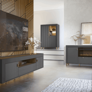 Kolekcja Naro to nowoczesna linia mebli, która wyróżnia się eleganckim designem i wysoką funkcjonalnością, idealnie pasującą do salonu, pokoju dziennego czy sypialni. Charakterystycznym elementem tej kolekcji są wysokie nóżki, gustowne uchwyty oraz proste, masywne bryły dostępne w kolorze bieli, czerni i kaszmiru, wzbogacone o akcenty w odcieniu dębu wiskey. Efekt 3D, nadawany przez prążkowane fronty, podkreśla nowoczesność i styl mebli. Bogaty wybór elementów, takich jak komody, witryny, szafy, regały, ławy, stoliki nocne oraz szafki RTV, pozwala na indywidualne aranżacje wnętrz, dostosowane do potrzeb każdego pomieszczenia.