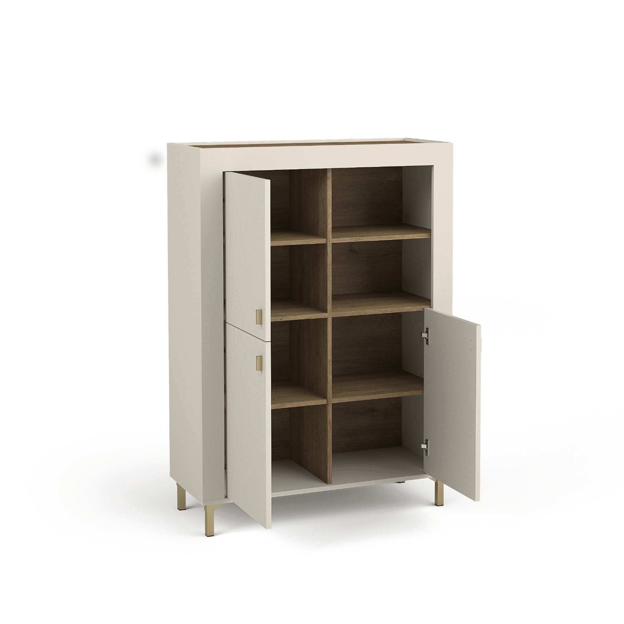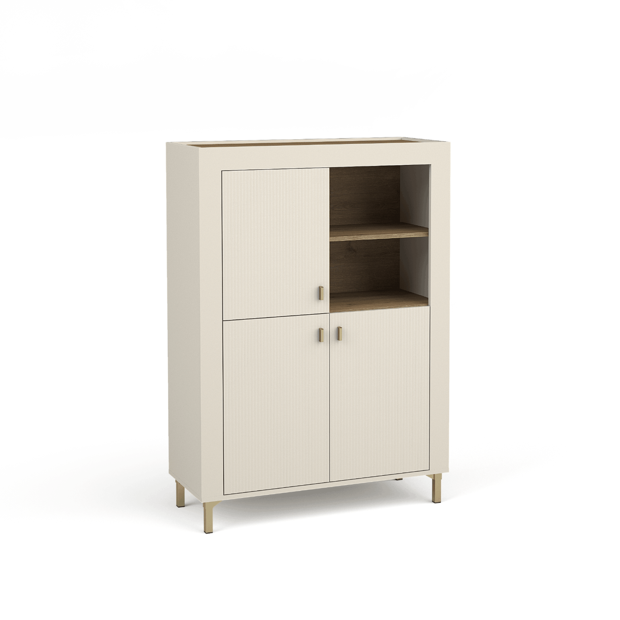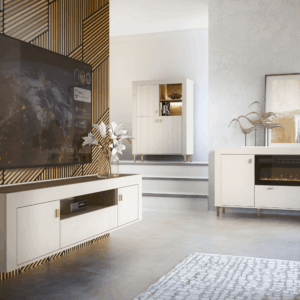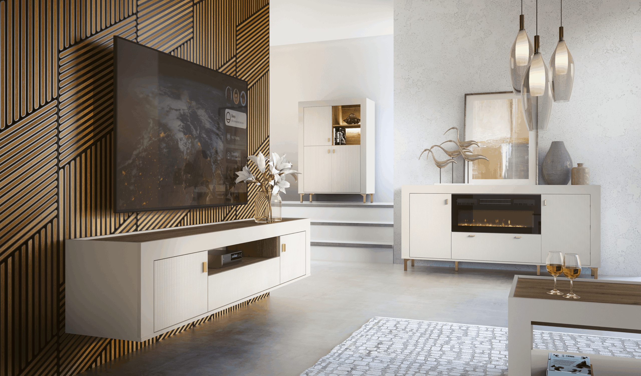 Kolekcja Naro to nowoczesna linia mebli, która wyróżnia się eleganckim designem i wysoką funkcjonalnością, idealnie pasującą do salonu, pokoju dziennego czy sypialni. Charakterystycznym elementem tej kolekcji są wysokie nóżki, gustowne uchwyty oraz proste, masywne bryły dostępne w kolorze bieli, czerni i kaszmiru, wzbogacone o akcenty w odcieniu dębu wiskey. Efekt 3D, nadawany przez prążkowane fronty, podkreśla nowoczesność i styl mebli. Bogaty wybór elementów, takich jak komody, witryny, szafy, regały, ławy, stoliki nocne oraz szafki RTV, pozwala na indywidualne aranżacje wnętrz, dostosowane do potrzeb każdego pomieszczenia.
