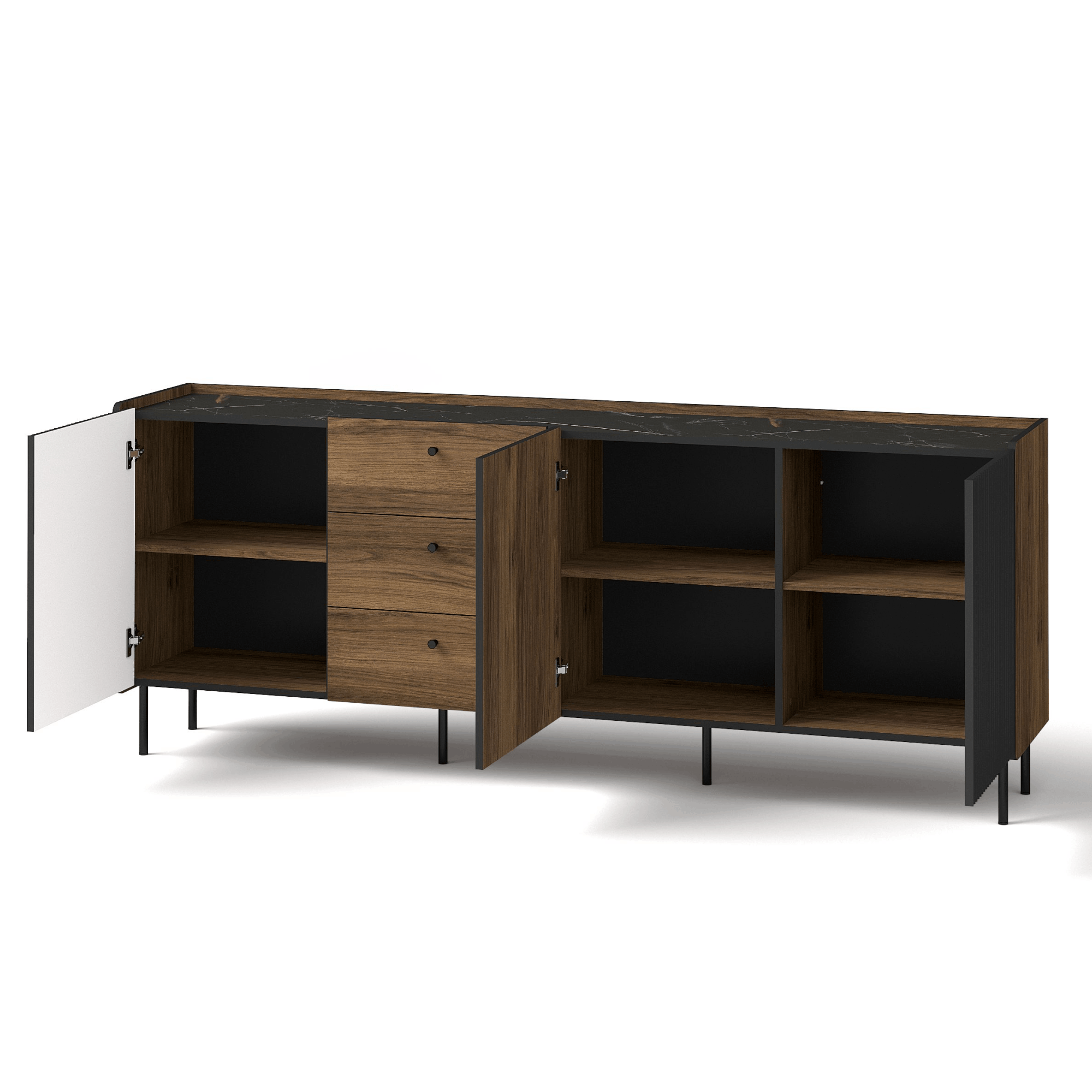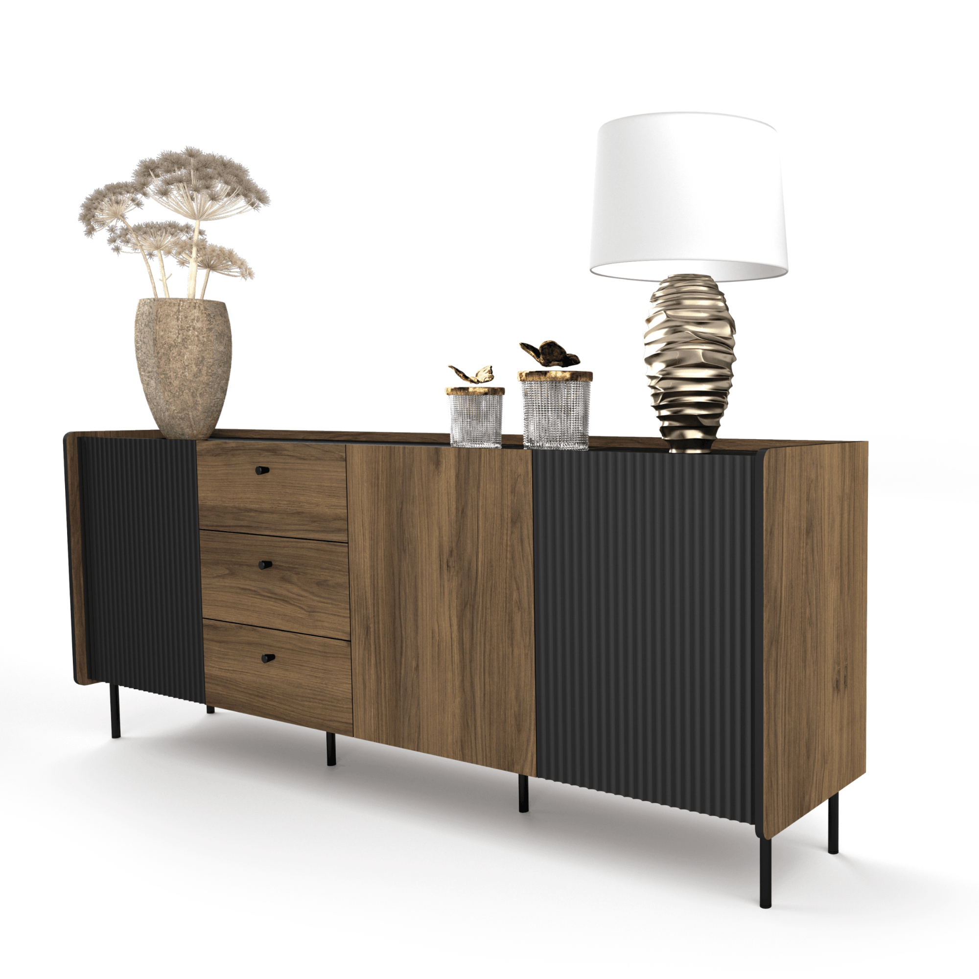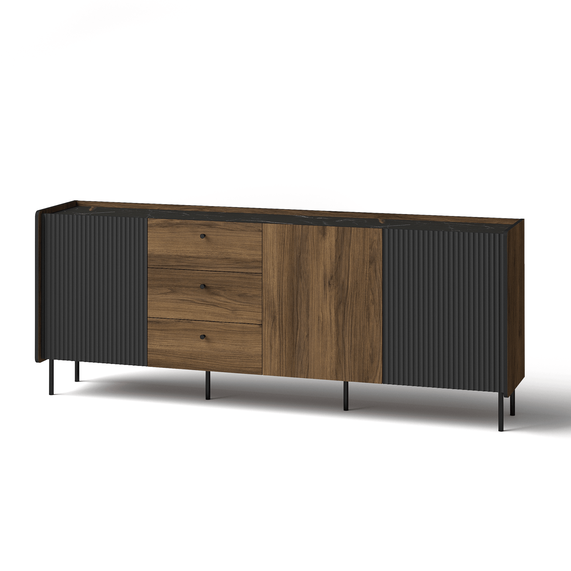 Royale to nowoczesna kolekcja mebli, łącząca styl i funkcjonalność. Charakteryzuje się eleganckim połączeniem kolorów: orzech Warmia, czarny mat, oraz dekoru San Sebastian. Ryflowane fronty i metalowe nogi nadają meblom nowoczesnego, prestiżowego wyglądu. Kolekcja oferuje szeroki wybór elementów, takich jak komody, szafki RTV, stoły, łóżka i biurka, które doskonale sprawdzą się w każdym pomieszczeniu. Royale to idealne rozwiązanie dla osób ceniących styl, wysoką jakość i praktyczne zastosowanie.