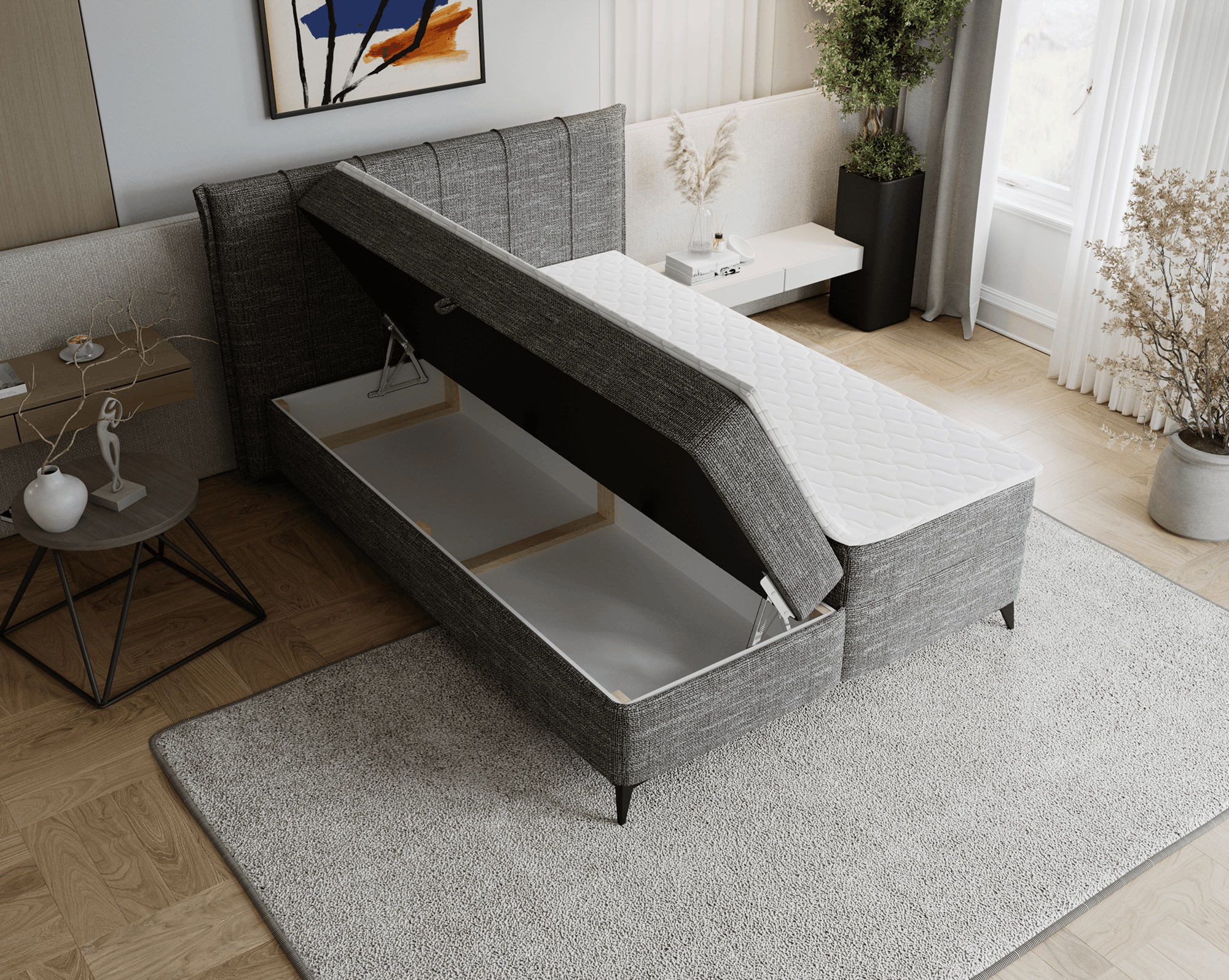 Wbudowany materac oparty na sprężynach bonell zapewnia stabilne podparcie ciała i odpowiednią elastyczność. Połączenie pianki poliuretanowej oraz konstrukcji sprężynowej gwarantuje wygodę snu i trwałość na lata.