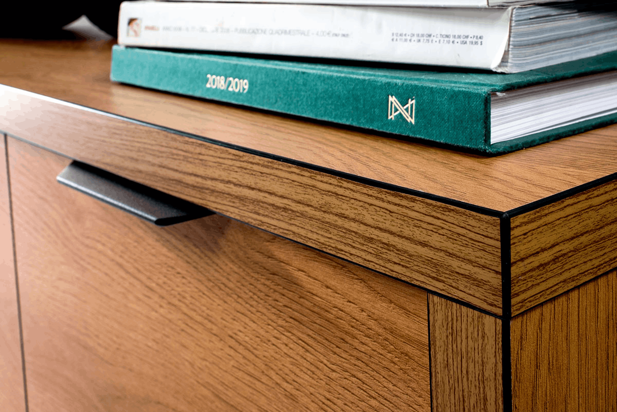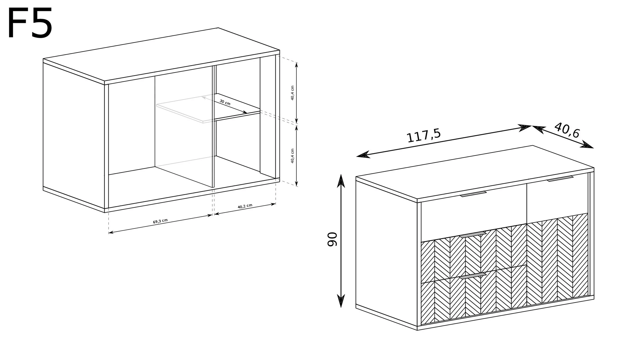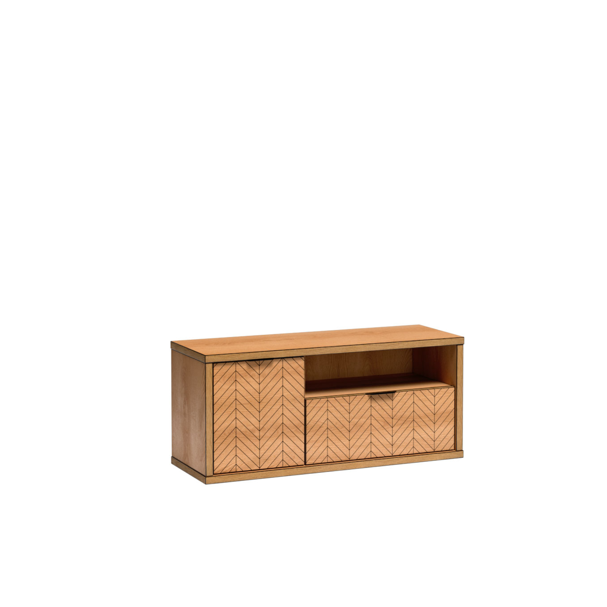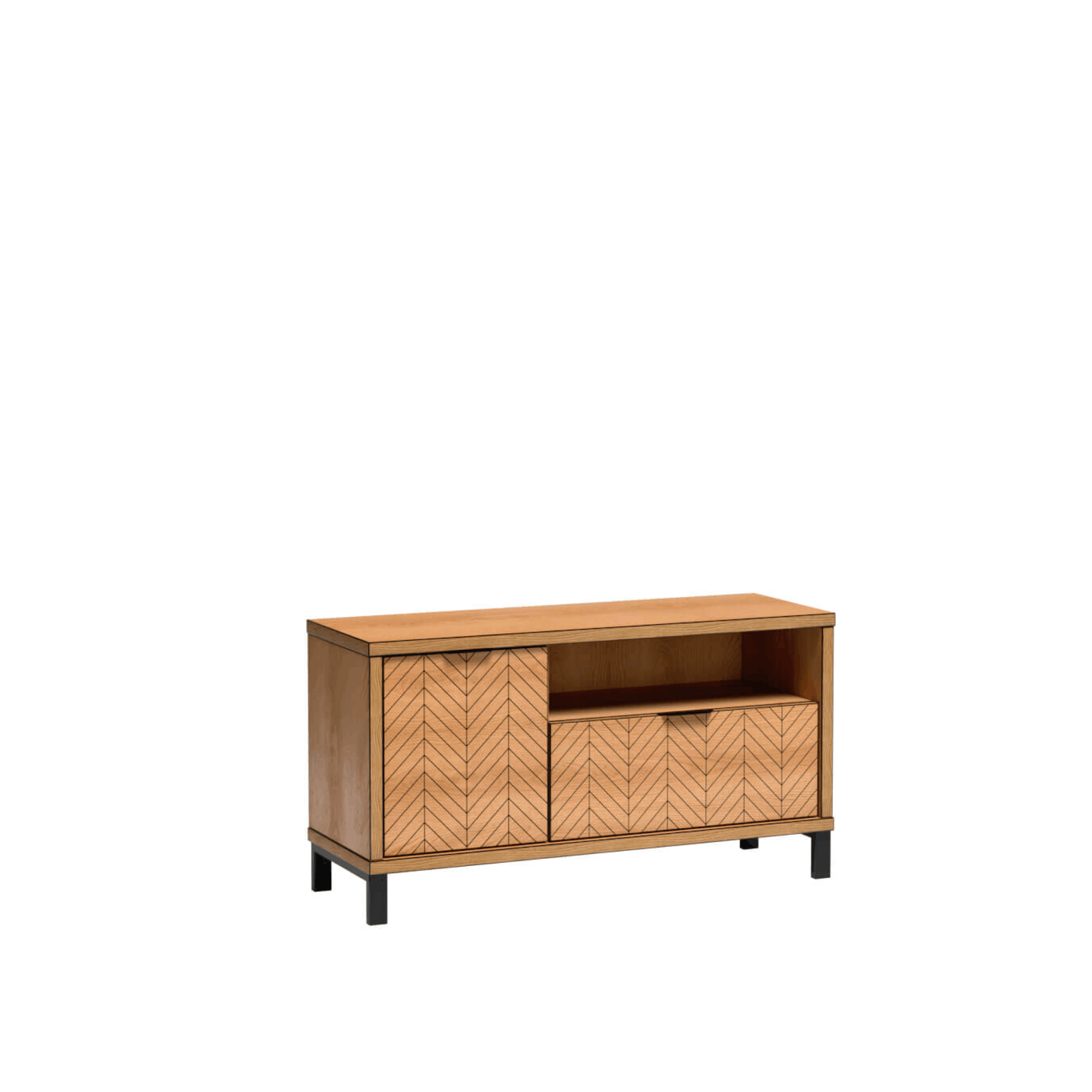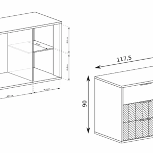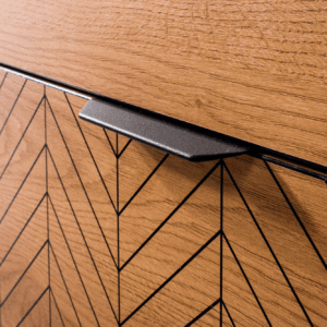 Fronty zdobione czarną jodełką oraz matowe uchwyty podkreślają nowoczesny design. Proste, geometryczne bryły sprawiają, że meble doskonale pasują do salonu, sypialni i jadalni.
