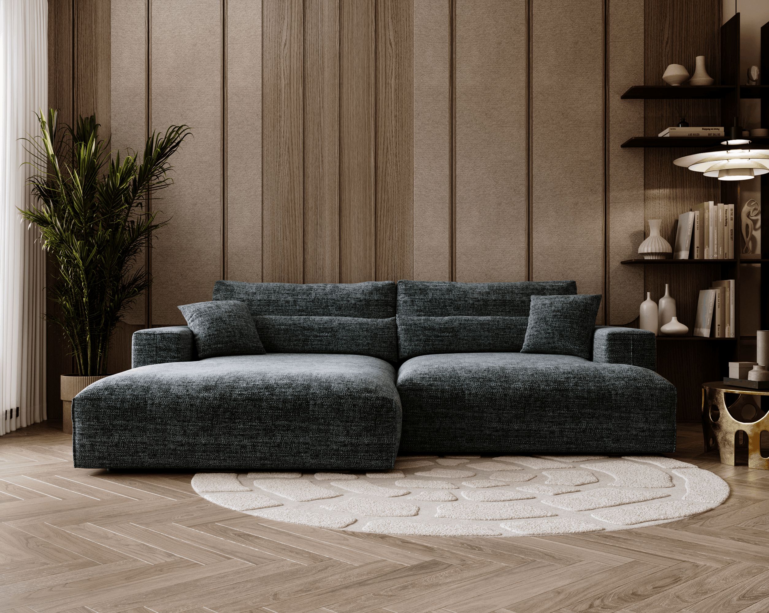 ☑️ Prosta konstrukcja – brak funkcji spania i pojemnika na pościel podkreśla minimalistyczny i nowoczesny charakter narożnika.