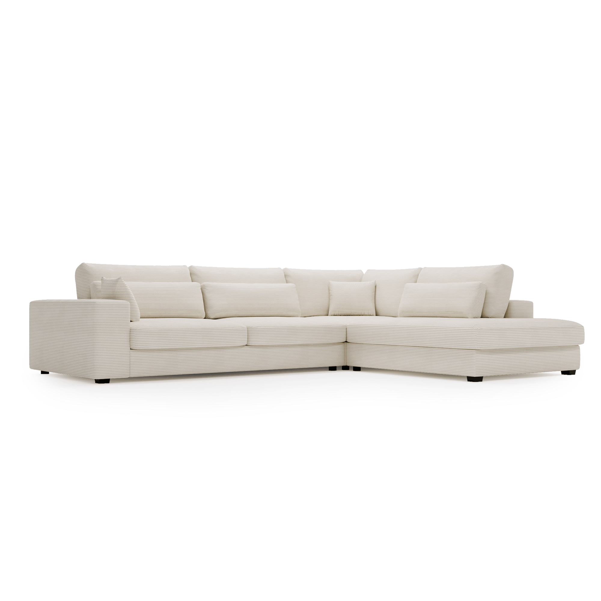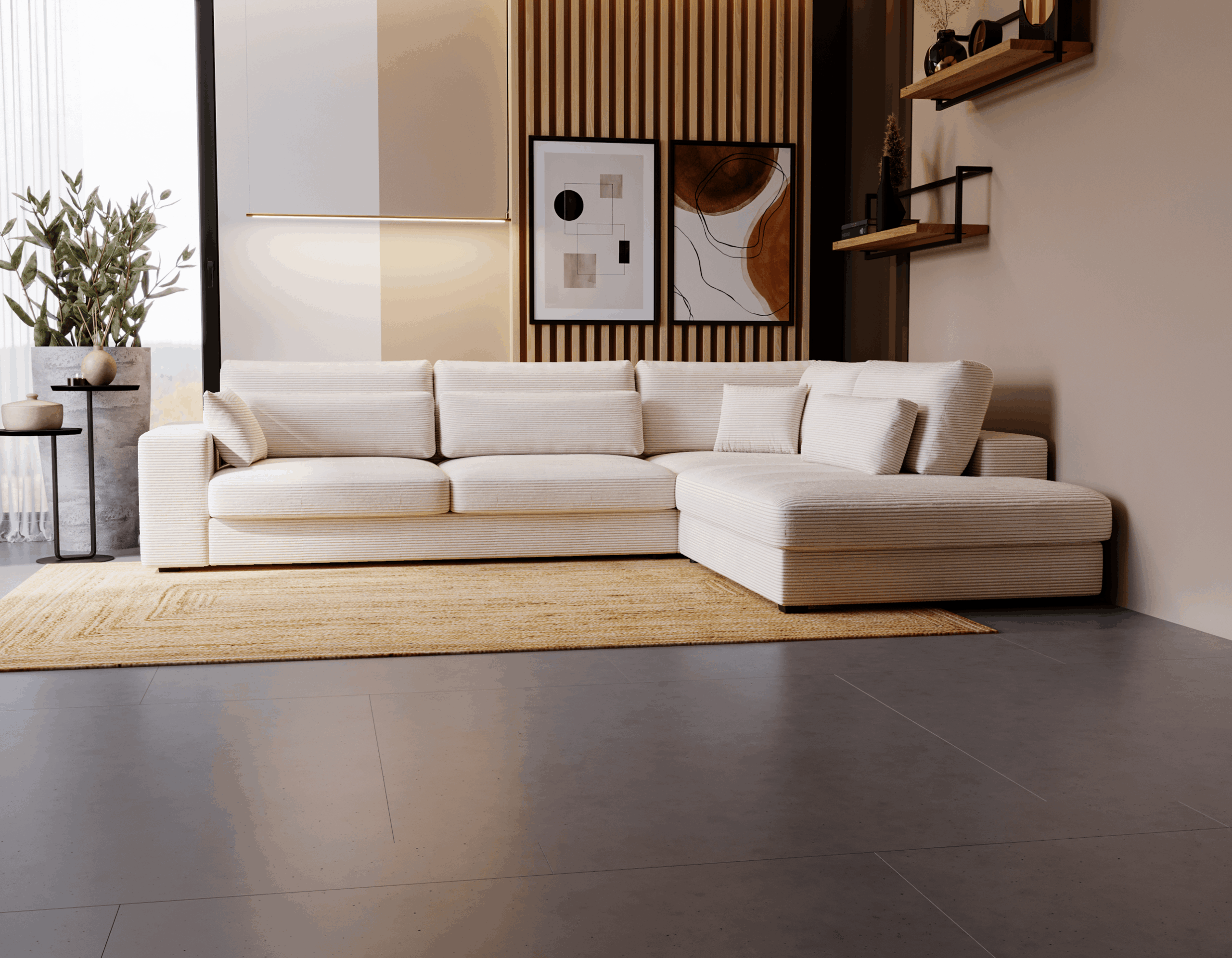 Narożnik Naso to nowoczesny i elegancki mebel, idealny do salonu lub przestronnego pokoju dziennego. Jego minimalistyczny design i imponująca szerokość 320 cm sprawiają, że pomieści wiele osób, zachowując jednocześnie wygodę. Wyposażony w sprężyny faliste, zapewnia doskonałe wsparcie i komfort. Pięknie wykończony z każdej strony, może być ustawiony w dowolnym miejscu. Dzięki możliwości wyboru strony narożnika, Naso łatwo dopasujesz do układu pomieszczenia, czyniąc go funkcjonalnym i stylowym dodatkiem.