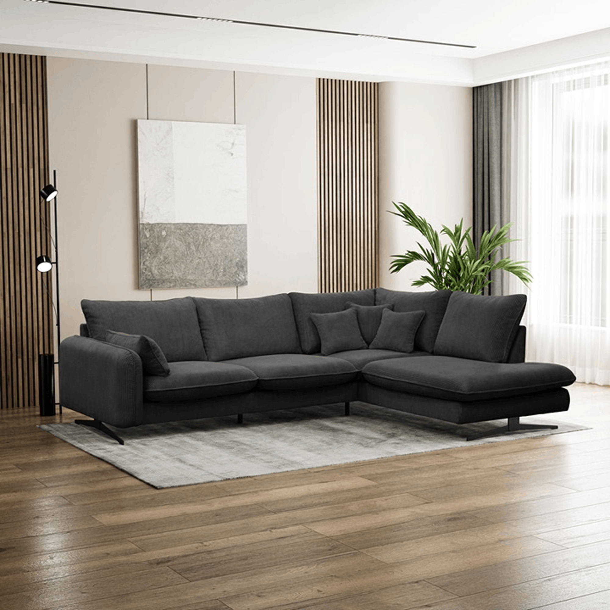 Narożnik Pello to propozycja dla osób, które cenią wygodę i przytulny charakter wnętrza. Jego miękka, harmonijna forma oraz szerokie poduszki sprawiają, że od pierwszego spojrzenia zachęca do relaksu. To mebel, który doskonale odnajdzie się zarówno w nowoczesnych, jak i bardziej klasycznych aranżacjach.