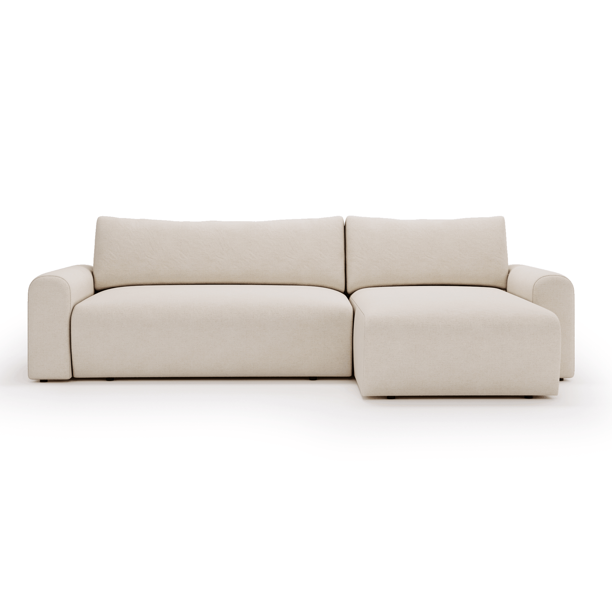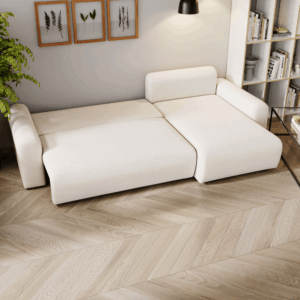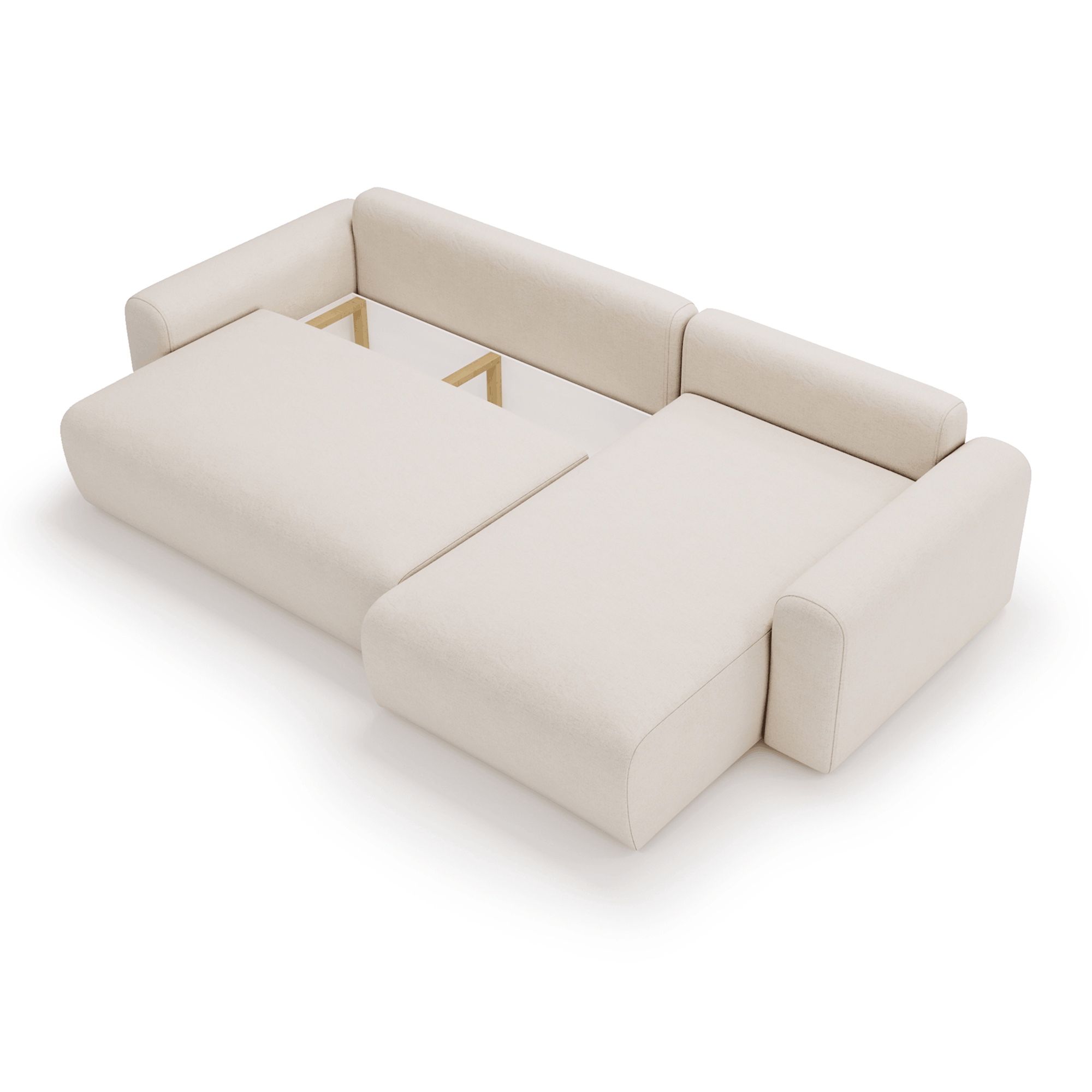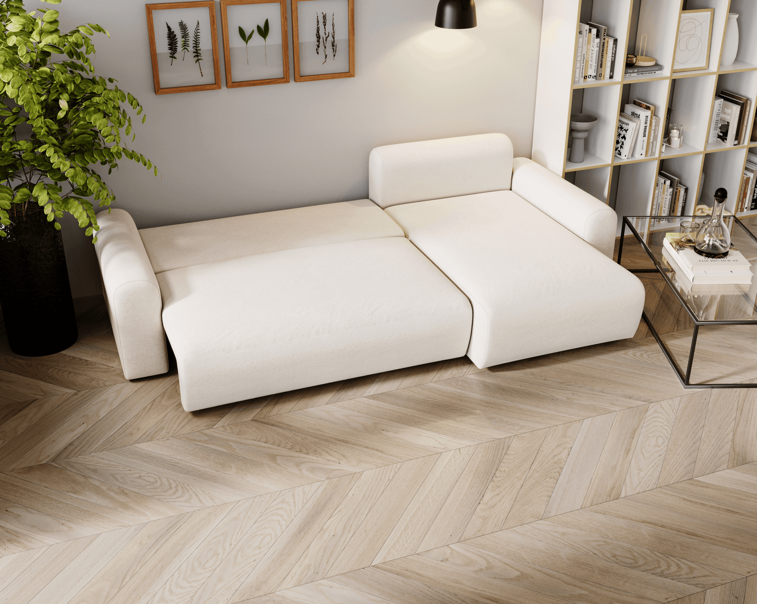 Wyposażony w system DL, narożnik szybko zmienia się w wygodne łóżko o powierzchni spania 132×203 cm – idealne zarówno do codziennego użytku, jak i do przenocowania gości.