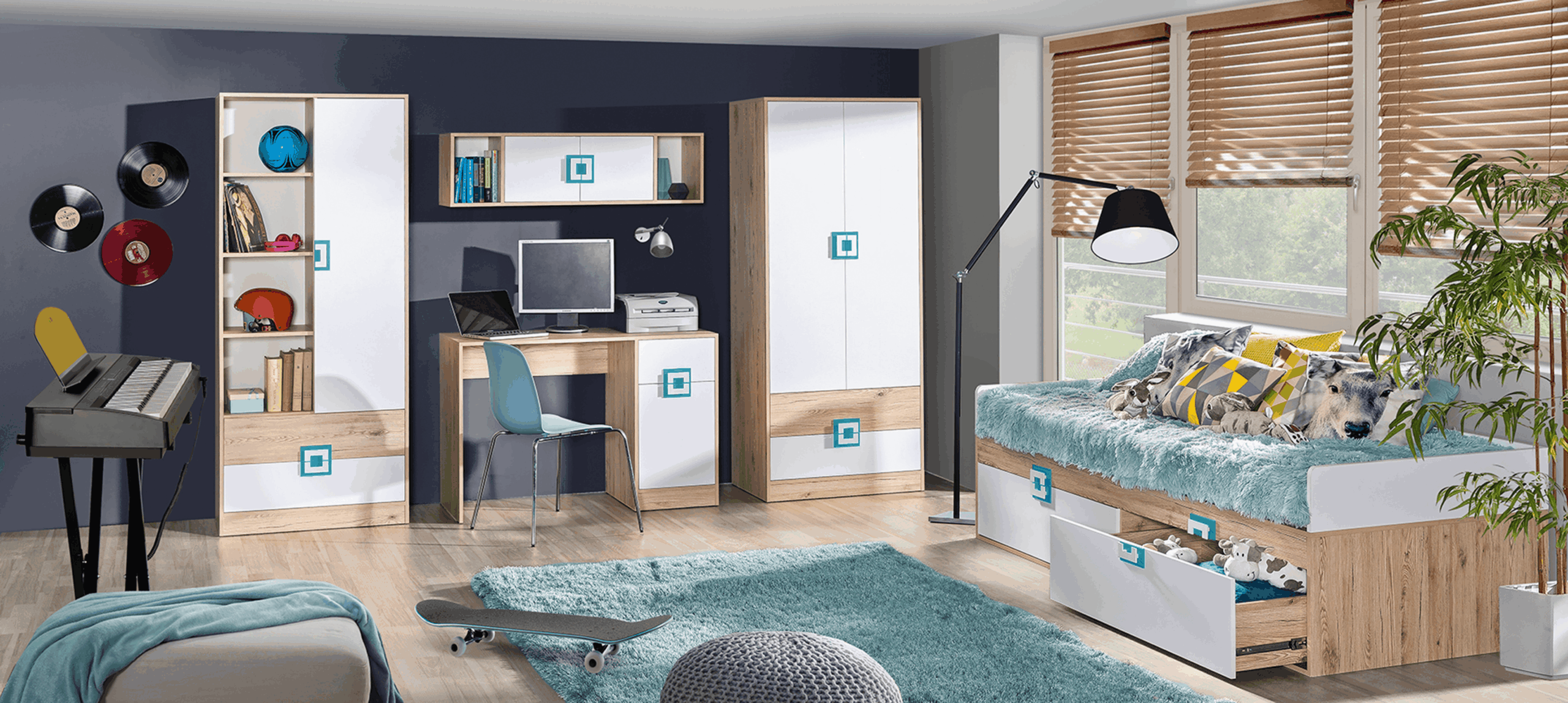Kolekcja mebli Vamex to nowoczesne, młodzieżowe rozwiązanie w kolorach jasnego dębu, różu, szarości, turkusu i bieli, idealnie sprawdzające się w pokoju sypialnianym. Dzięki uniwersalnemu designowi, meble z tej kolekcji wprowadzą do wnętrza świeżość i styl, a ich funkcjonalność sprawia, że równie dobrze prezentują się także w innych pomieszczeniach.