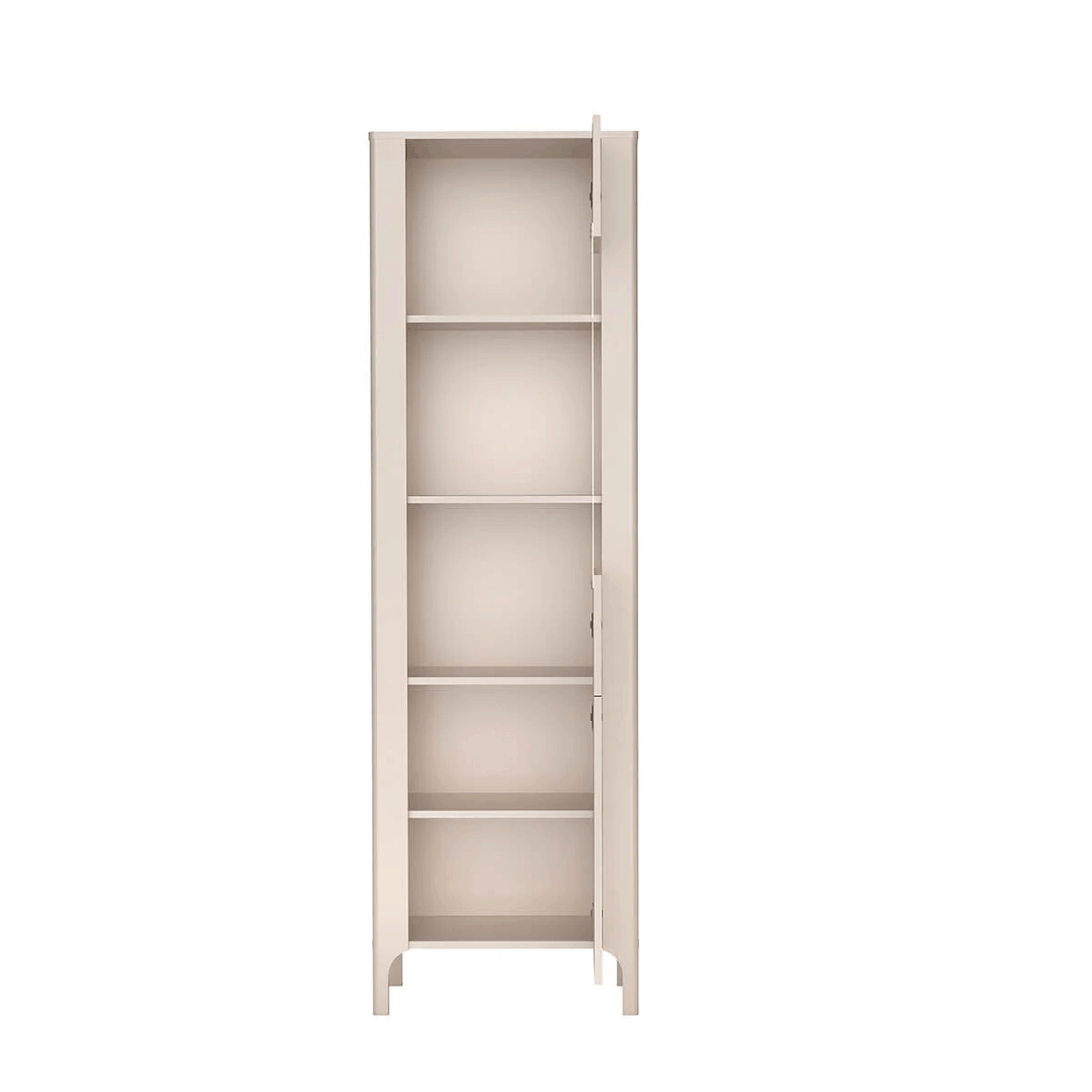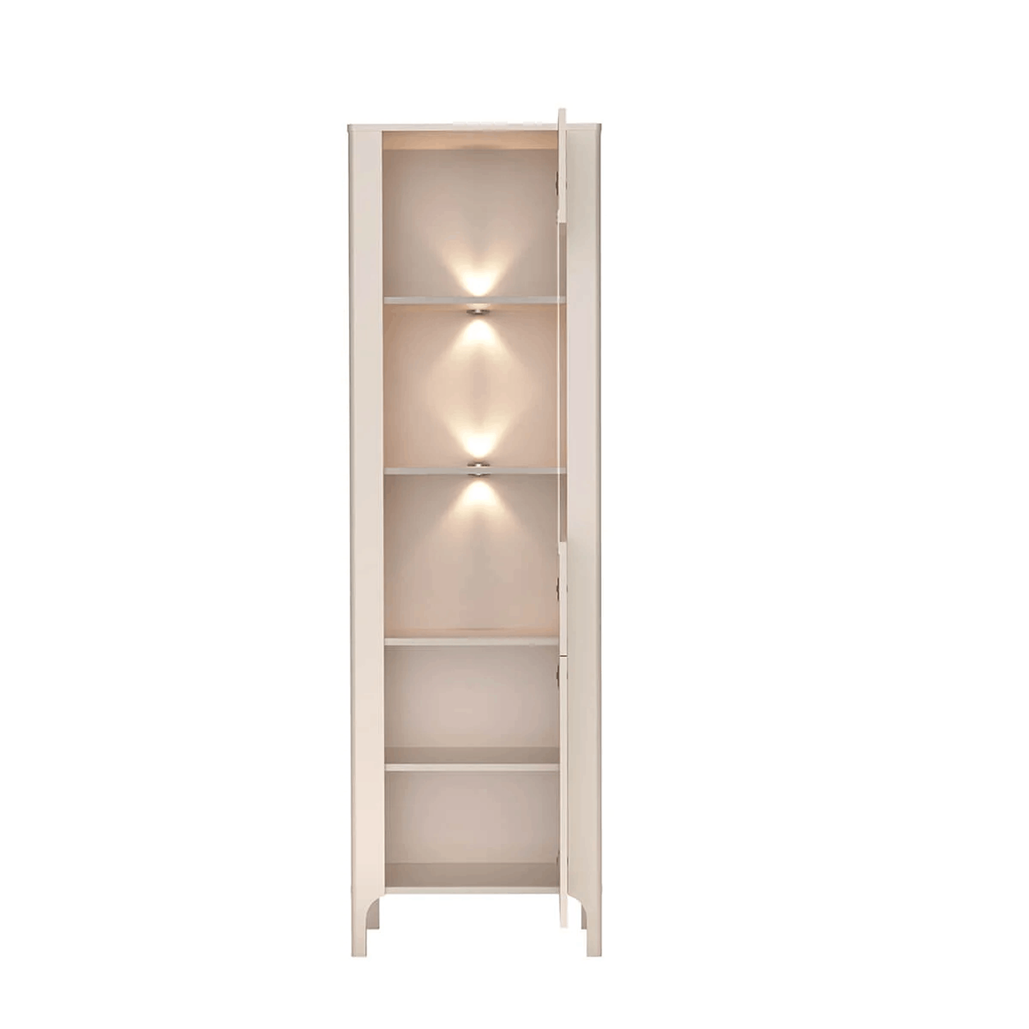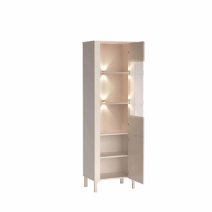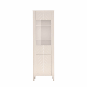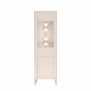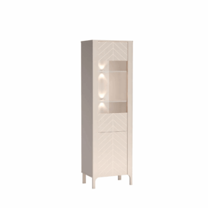 Meble wyróżniają się delikatnym wzorem jodełki na frontach oraz smukłymi nóżkami, które nadają bryłom lekkości i nowoczesnego charakteru. Dzięki temu całość prezentuje się elegancko, a jednocześnie nie przytłacza wnętrza.