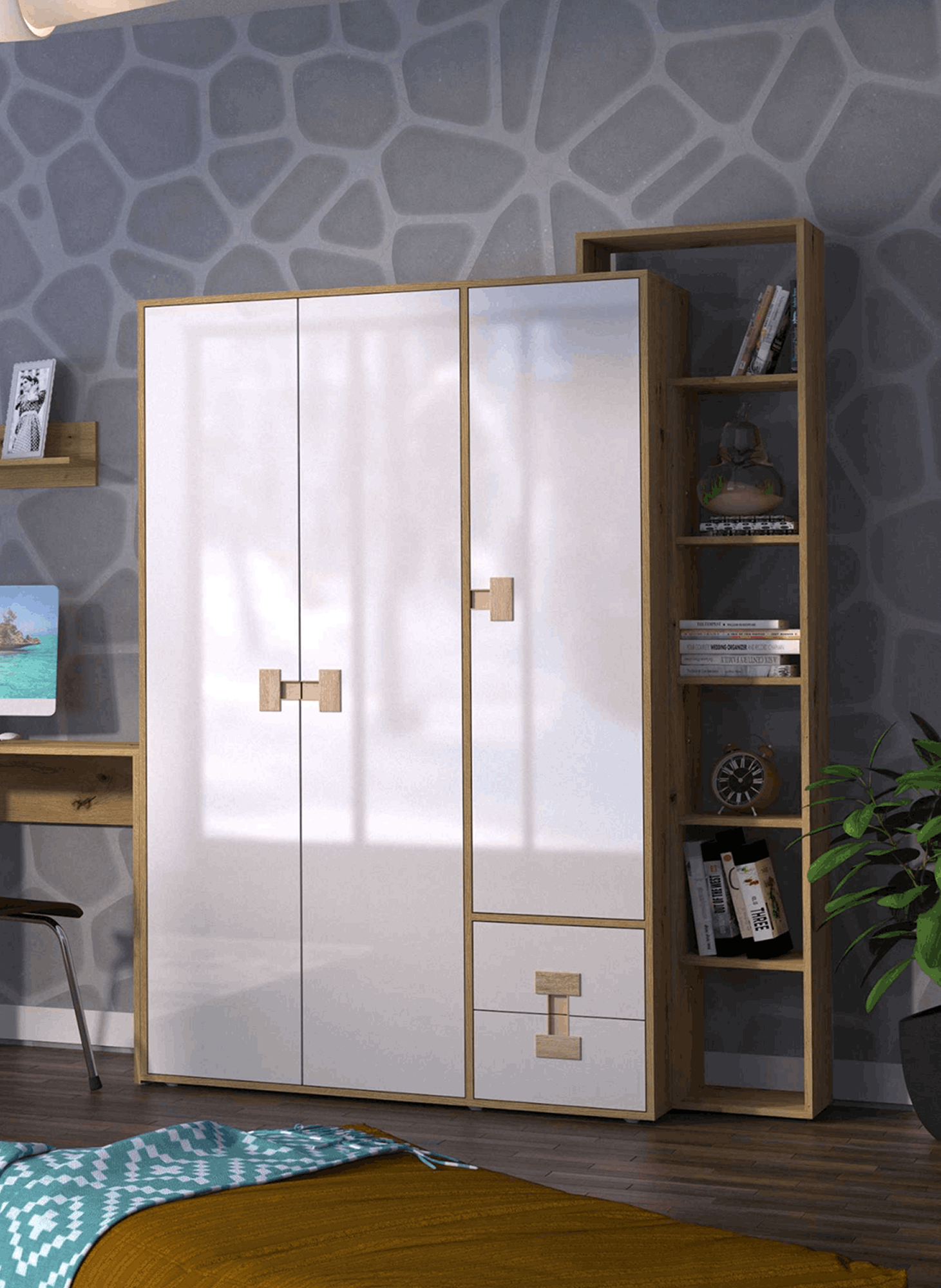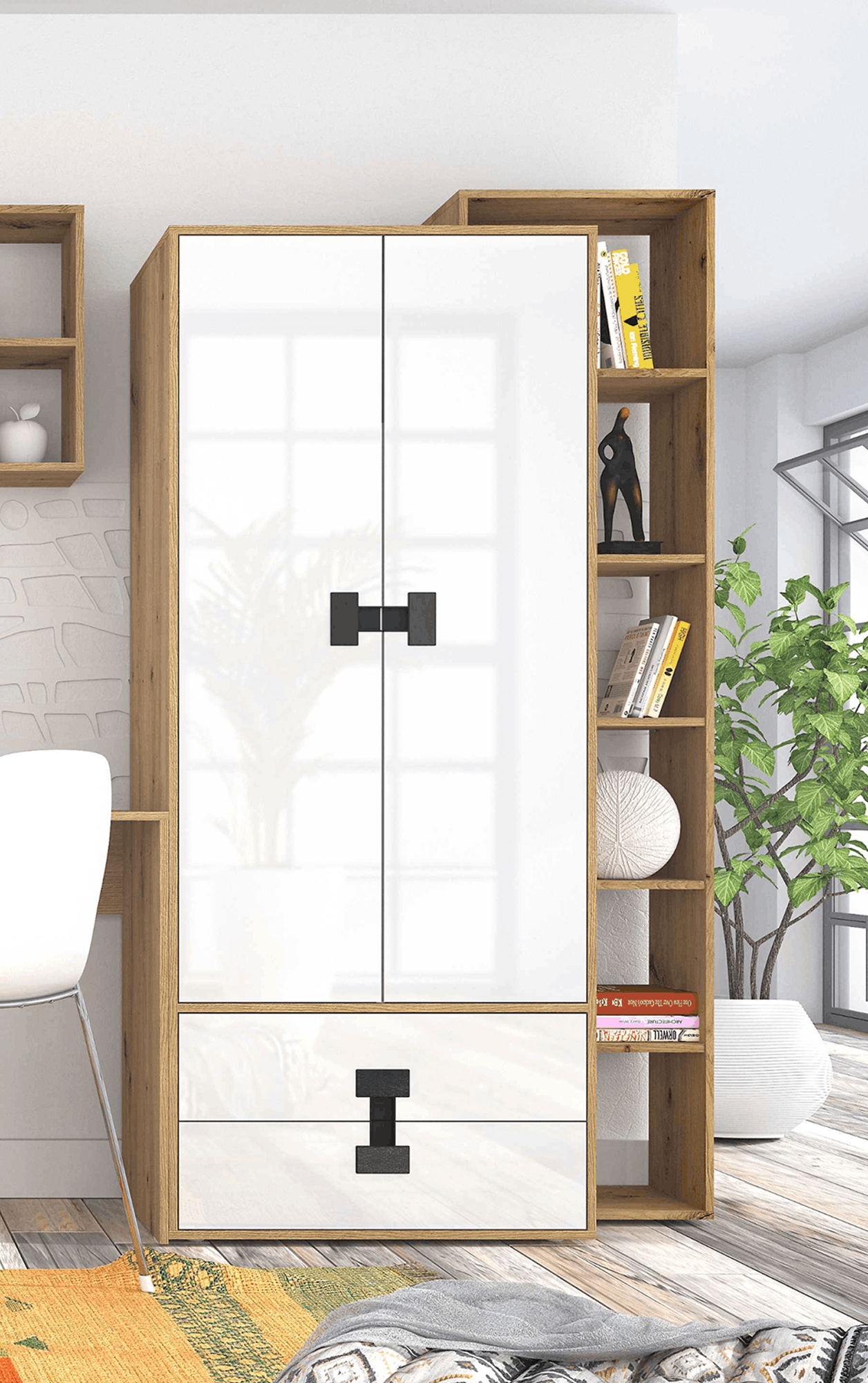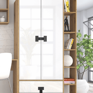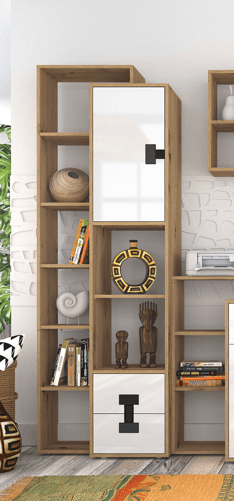 Przemyślany układ brył łączy otwarte półki z zamkniętymi szafkami, dzięki czemu możesz jednocześnie wyeksponować dekoracje i zachować porządek w przechowywanych przedmiotach. Kolekcja pozwala stworzyć spójną zabudowę dopasowaną do Twojej przestrzeni – zarówno w mniejszych, jak i większych pomieszczeniach.