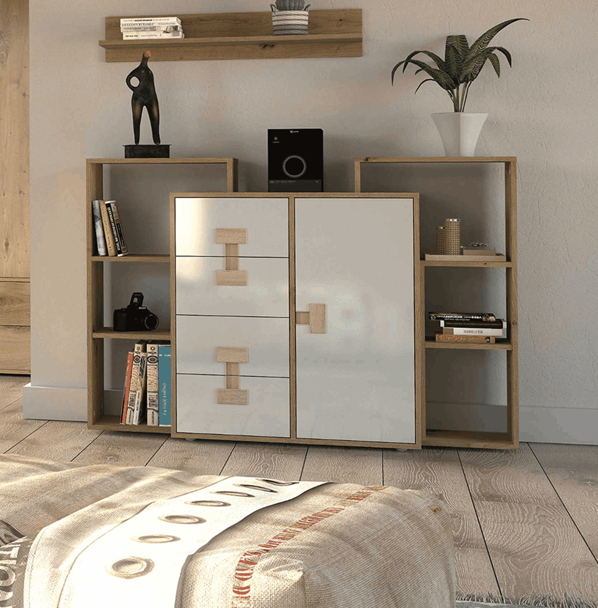 Przemyślany układ brył łączy otwarte półki z zamkniętymi szafkami, dzięki czemu możesz jednocześnie wyeksponować dekoracje i zachować porządek w przechowywanych przedmiotach. Kolekcja pozwala stworzyć spójną zabudowę dopasowaną do Twojej przestrzeni – zarówno w mniejszych, jak i większych pomieszczeniach.