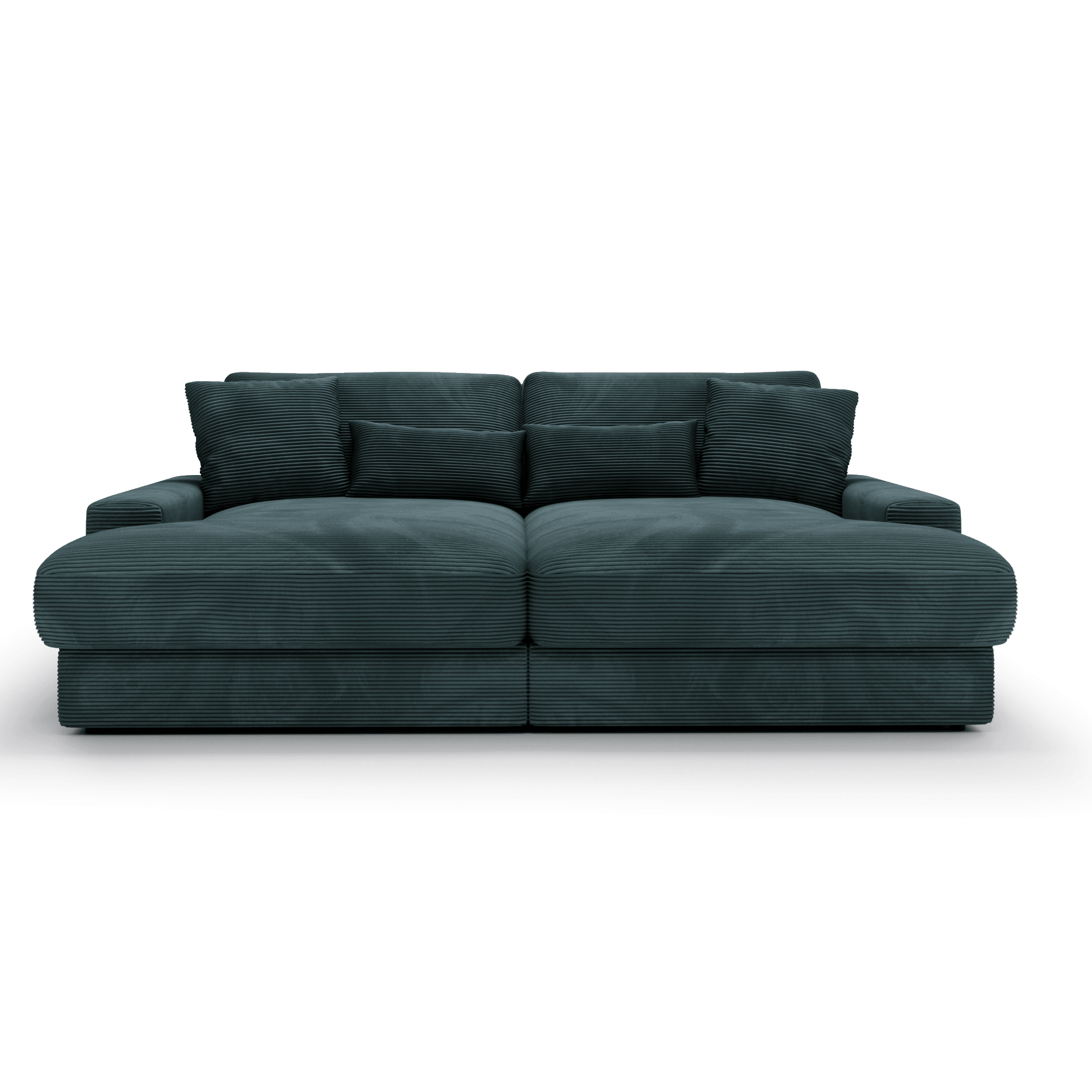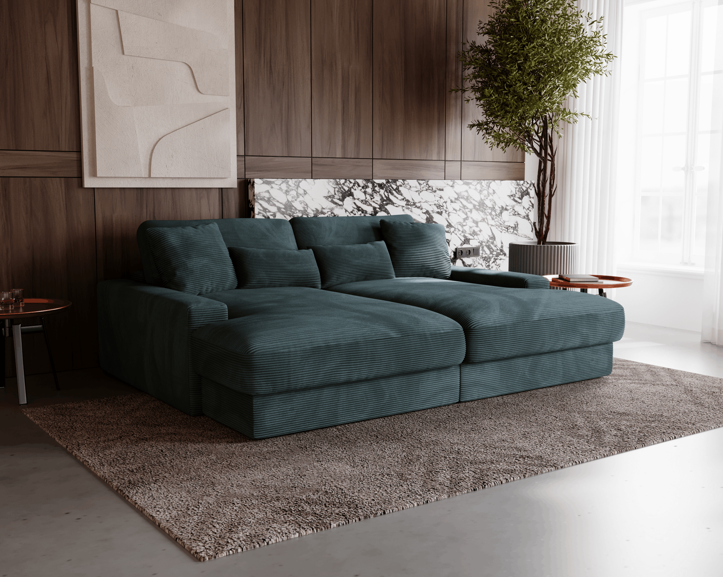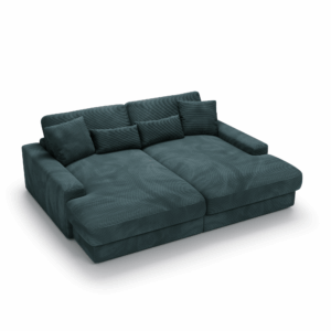 Obicie z miękkiej sztruksowej tkaniny nadaje Sofie Grand niepowtarzalny, ciepły charakter. Materiał ten świetnie odnajduje się zarówno w aranżacjach skandynawskich, jak i bardziej swobodnych, inspirowanych stylem vintage czy boho. Sofa prezentuje się pięknie w każdym ustawieniu, zarówno pod ścianą, jak i jako centralny punkt salonu, dzięki tapicerowanemu tyłowi.