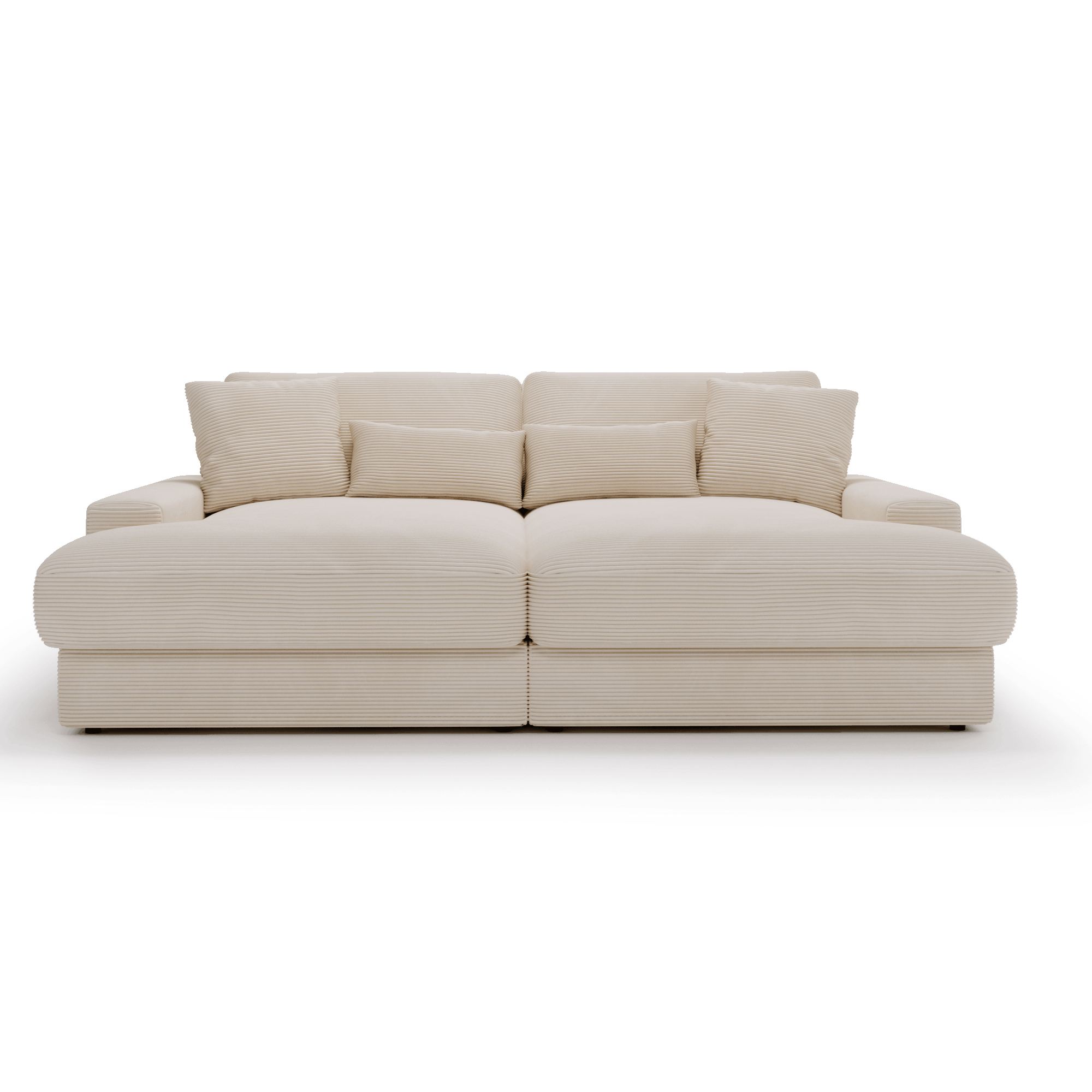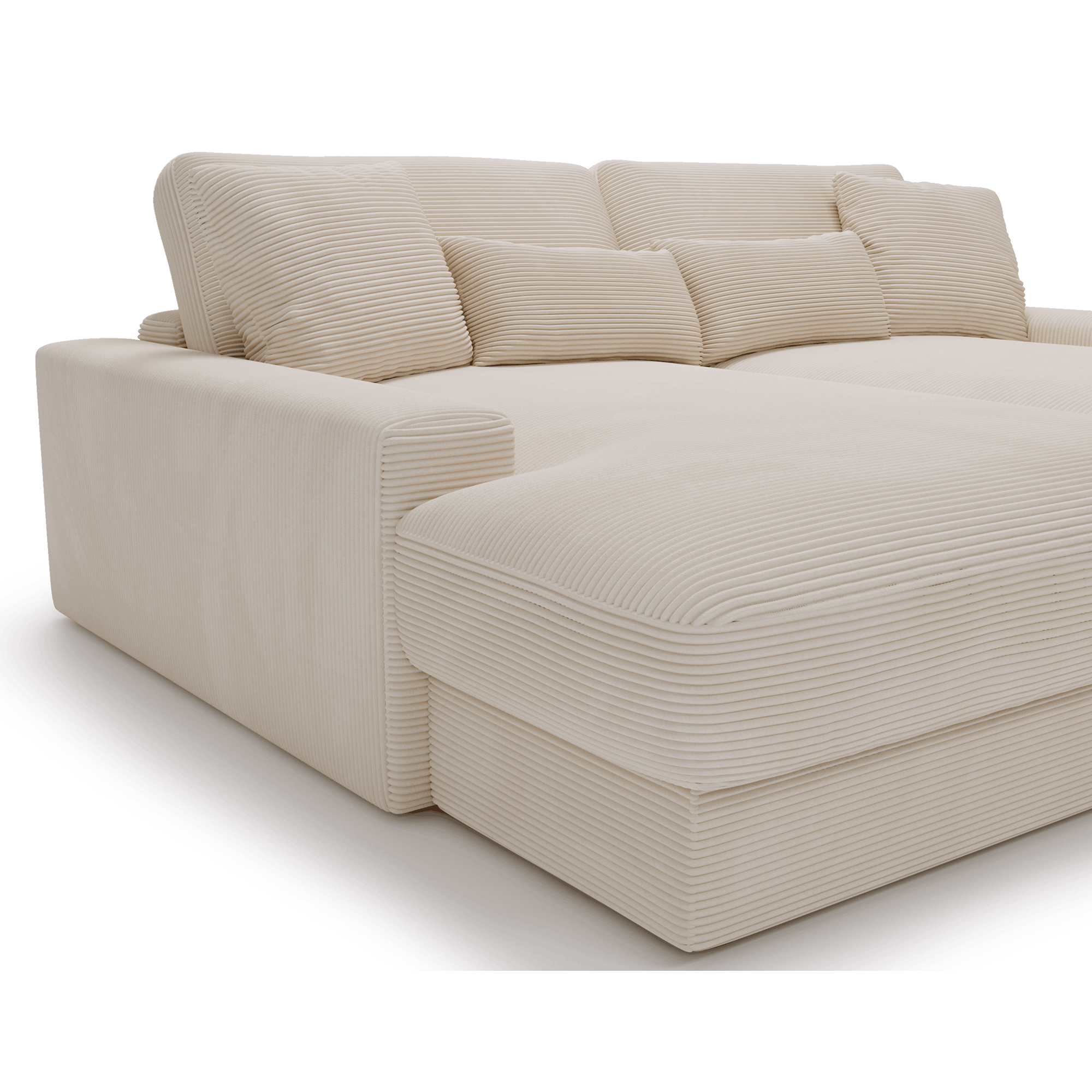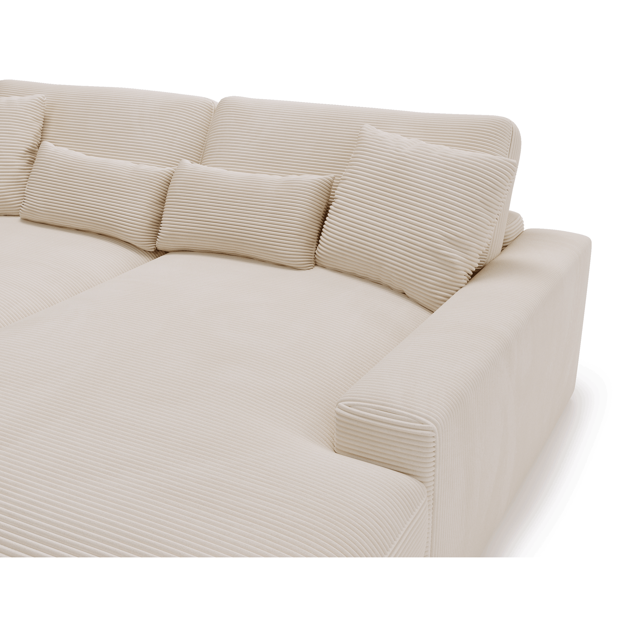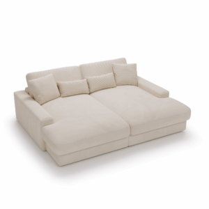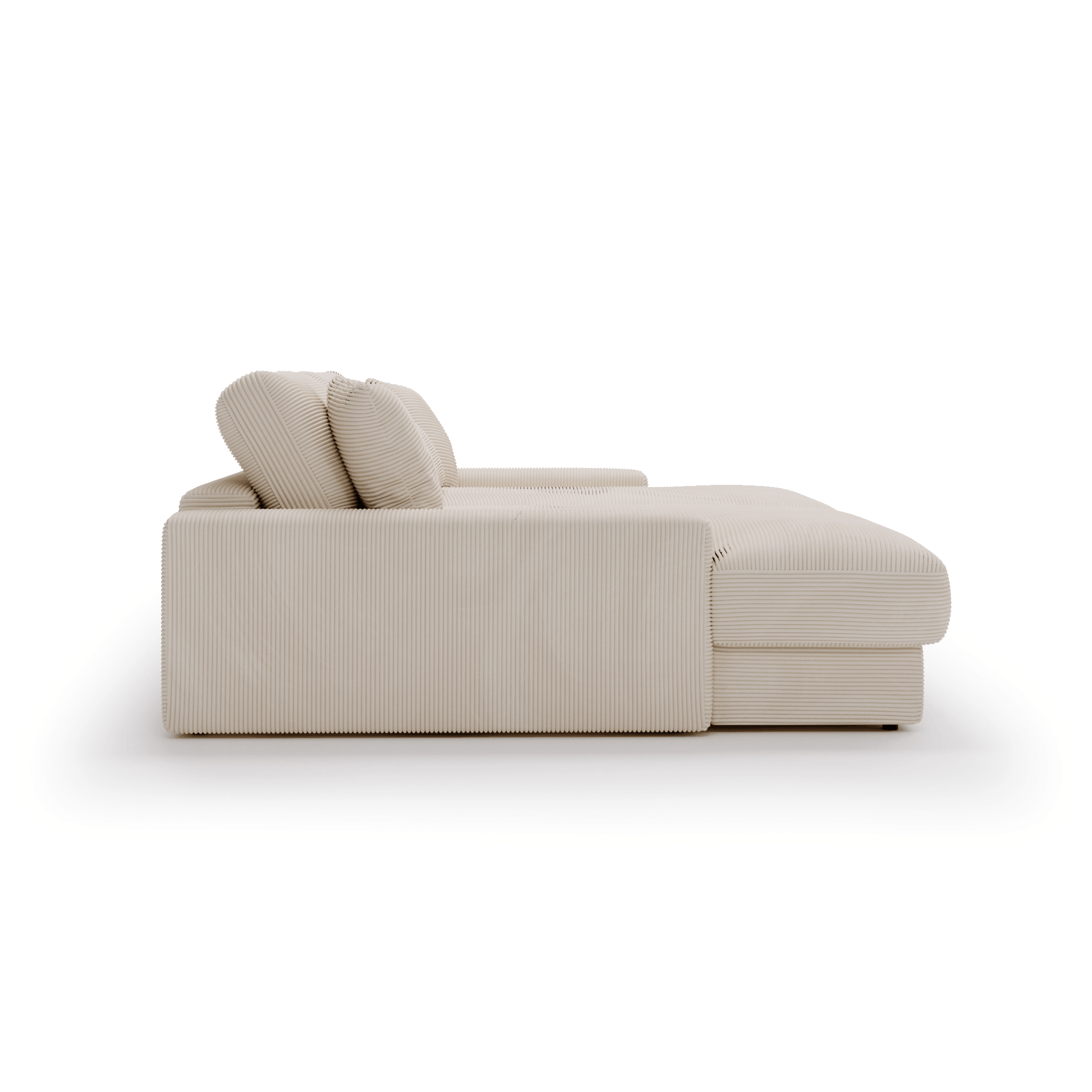 Obicie z miękkiej sztruksowej tkaniny nadaje Sofie Grand niepowtarzalny, ciepły charakter. Materiał ten świetnie odnajduje się zarówno w aranżacjach skandynawskich, jak i bardziej swobodnych, inspirowanych stylem vintage czy boho. Sofa prezentuje się pięknie w każdym ustawieniu, zarówno pod ścianą, jak i jako centralny punkt salonu, dzięki tapicerowanemu tyłowi.