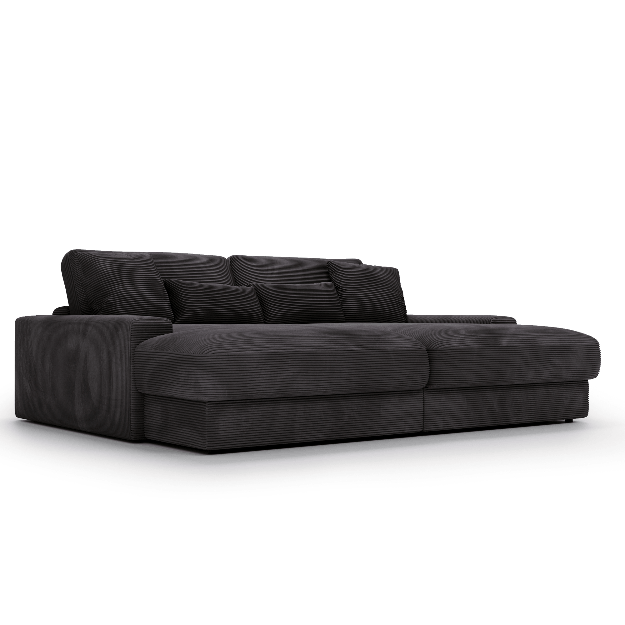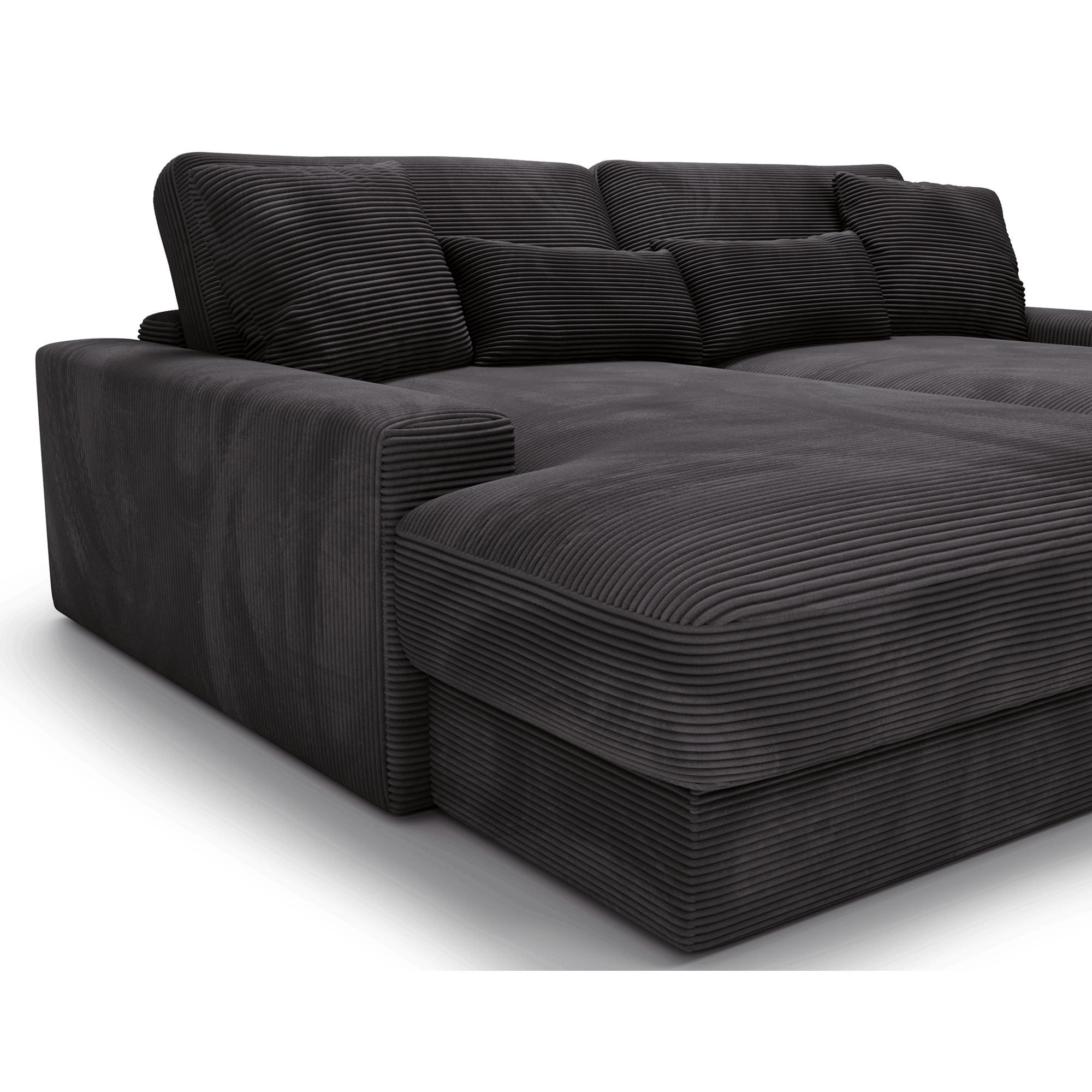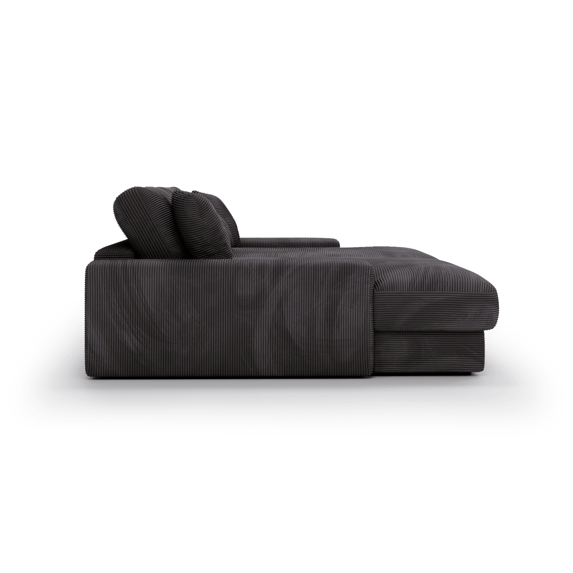 Obicie z miękkiej sztruksowej tkaniny nadaje Sofie Grand niepowtarzalny, ciepły charakter. Materiał ten świetnie odnajduje się zarówno w aranżacjach skandynawskich, jak i bardziej swobodnych, inspirowanych stylem vintage czy boho. Sofa prezentuje się pięknie w każdym ustawieniu, zarówno pod ścianą, jak i jako centralny punkt salonu, dzięki tapicerowanemu tyłowi.