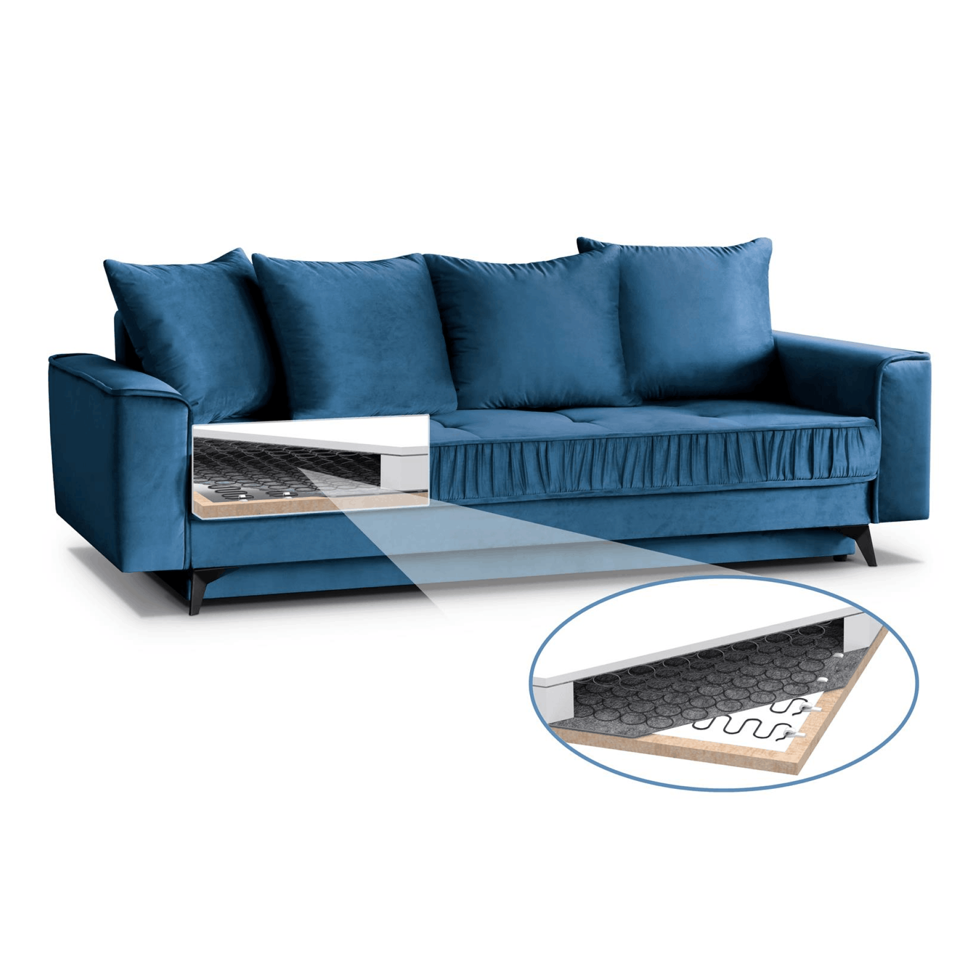 Wypełnienie oparte na sprężynach falistych oraz bonellowych zapewnia odpowiednią sprężystość i trwałość. Sofa oferuje wygodne podparcie, dzięki czemu świetnie sprawdzi się zarówno podczas codziennego odpoczynku, jak i dłuższego relaksu.