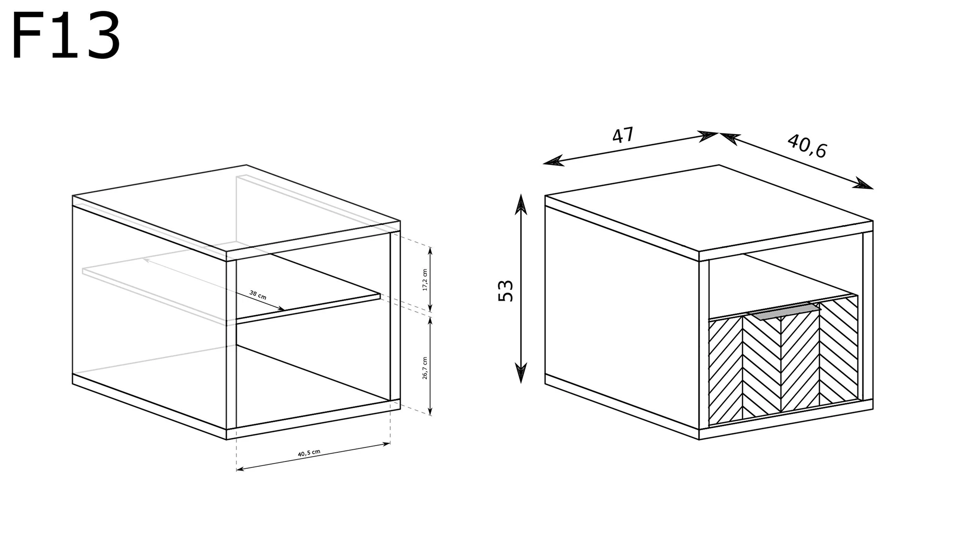 Fronty zdobione czarną jodełką oraz matowe uchwyty podkreślają nowoczesny design. Proste, geometryczne bryły sprawiają, że meble doskonale pasują do salonu, sypialni i jadalni.
