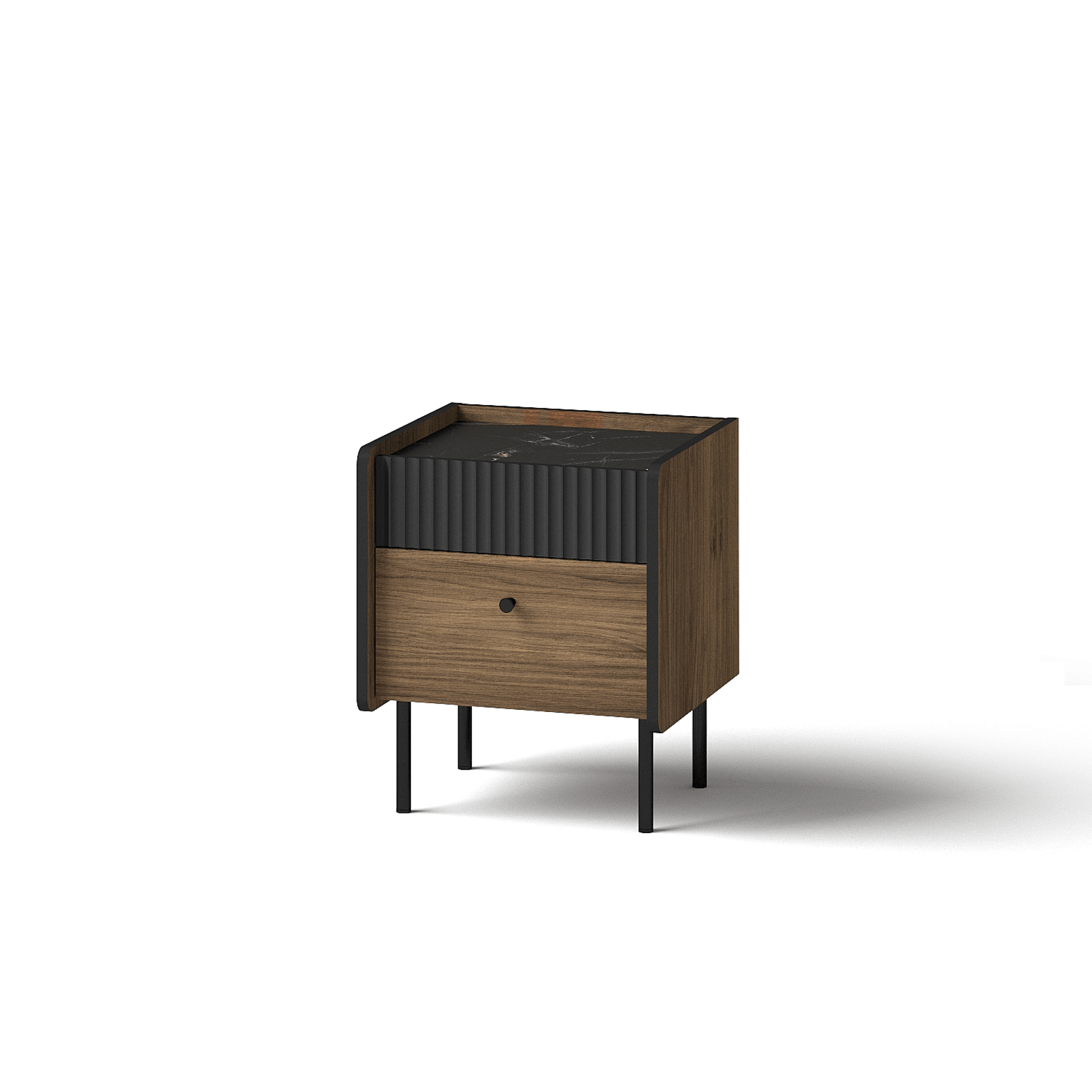 Royale to nowoczesna kolekcja mebli, łącząca styl i funkcjonalność. Charakteryzuje się eleganckim połączeniem kolorów: orzech Warmia, czarny mat, oraz dekoru San Sebastian. Ryflowane fronty i metalowe nogi nadają meblom nowoczesnego, prestiżowego wyglądu. Kolekcja oferuje szeroki wybór elementów, takich jak komody, szafki RTV, stoły, łóżka i biurka, które doskonale sprawdzą się w każdym pomieszczeniu. Royale to idealne rozwiązanie dla osób ceniących styl, wysoką jakość i praktyczne zastosowanie.