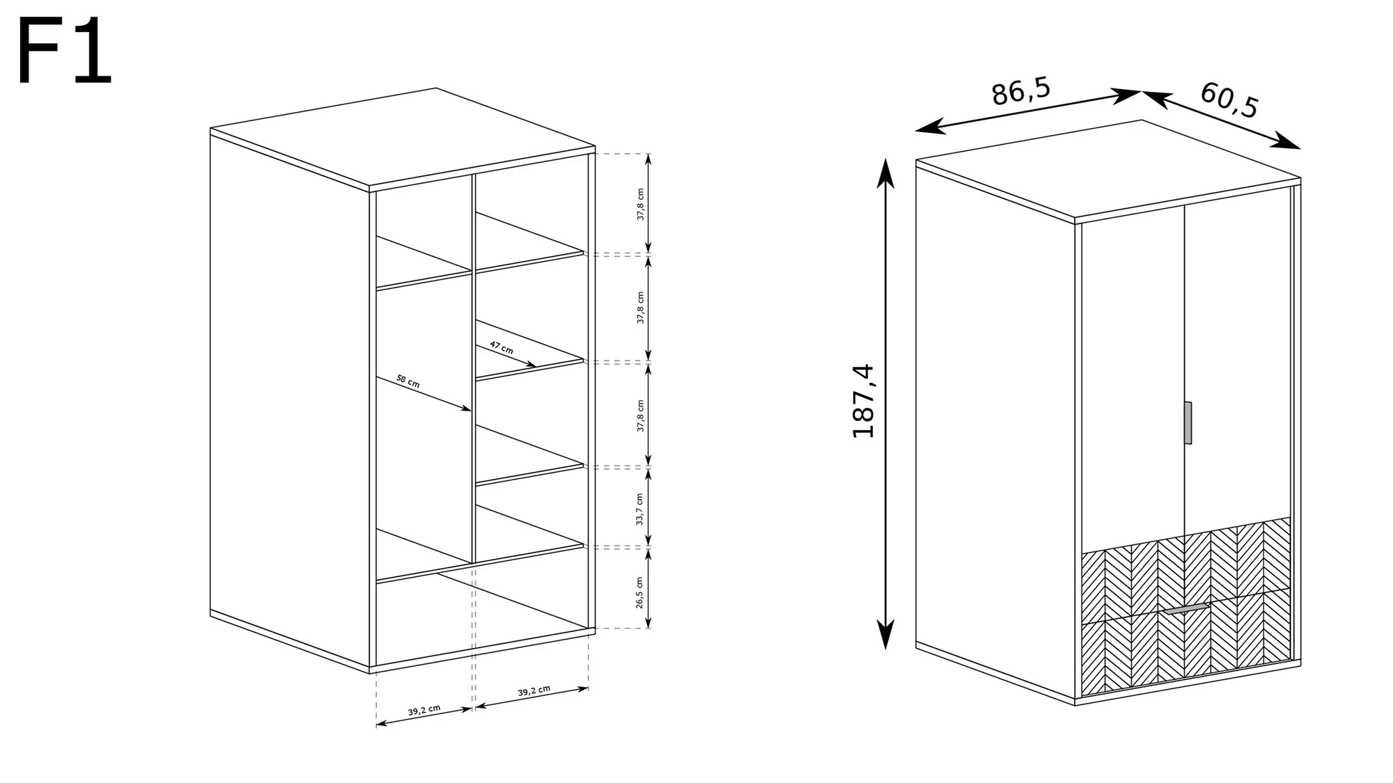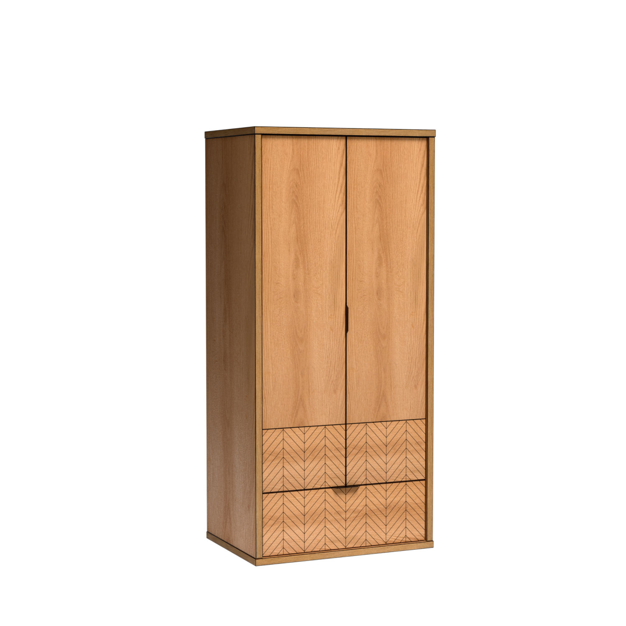 Fronty zdobione czarną jodełką oraz matowe uchwyty podkreślają nowoczesny design. Proste, geometryczne bryły sprawiają, że meble doskonale pasują do salonu, sypialni i jadalni.