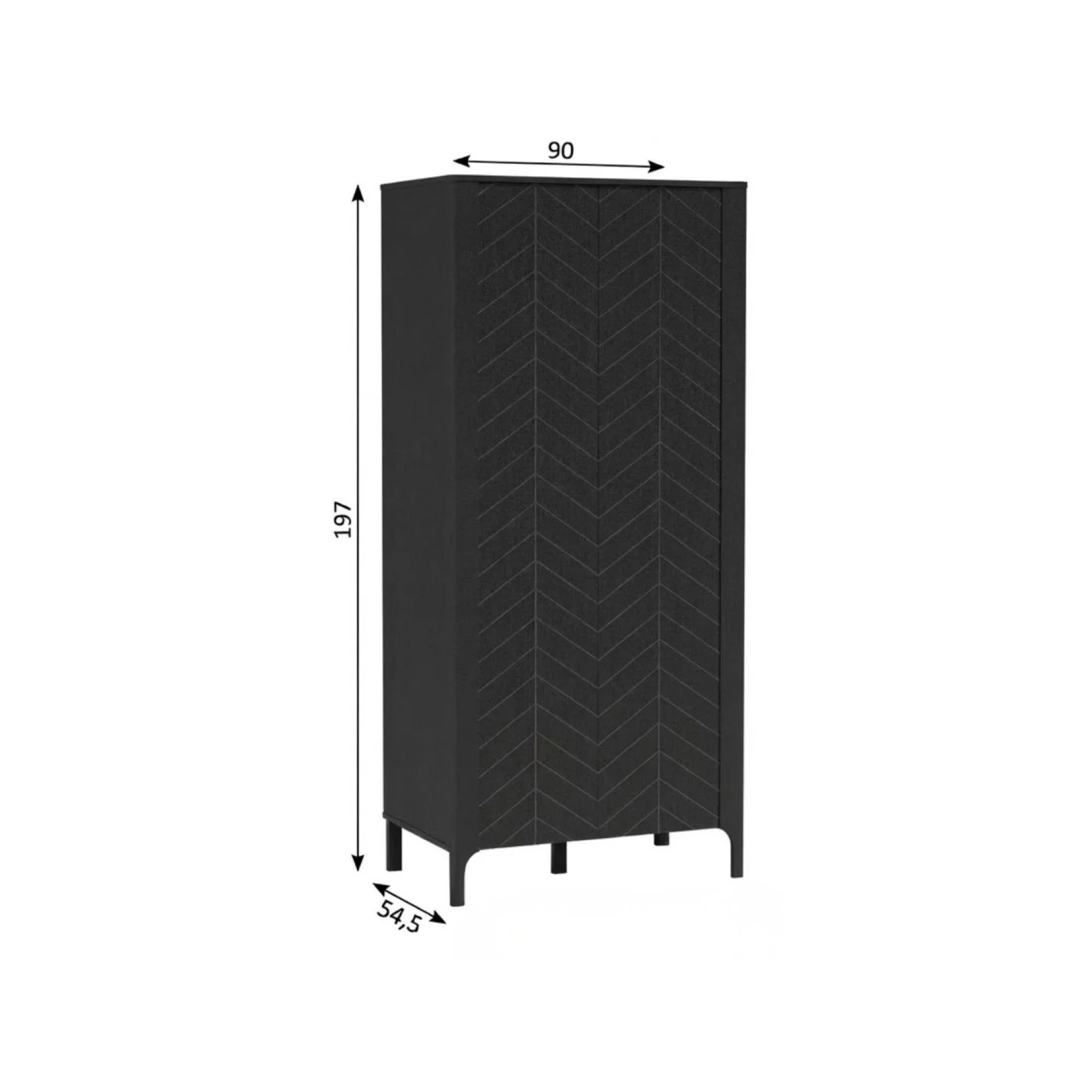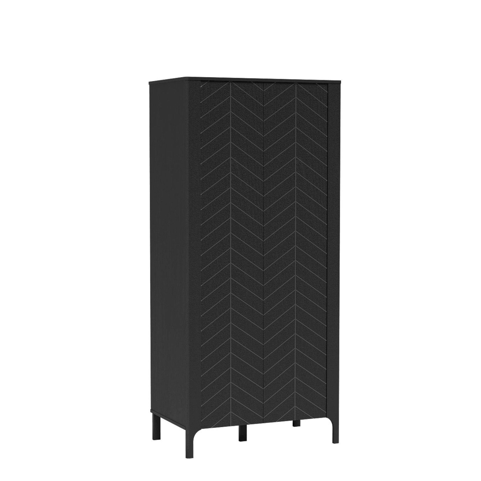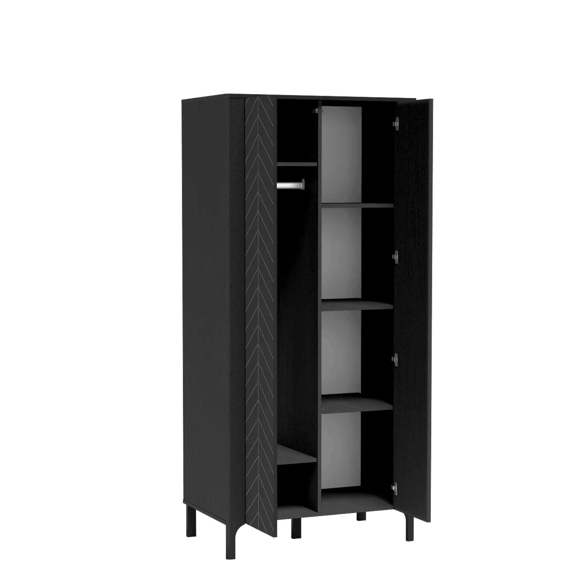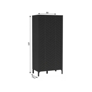 Front z dekoracyjną jodełką nadaje jej eleganckiego charakteru, a przemyślane wnętrze ułatwia organizację. Szafa wyposażona jest w drążek na wieszaki oraz praktyczne półki na ubrania i dodatki, a dolna przestrzeń sprawdzi się na buty lub inne akcesoria. Prosta forma i solidne wykonanie sprawiają, że mebel doskonale łączy styl z wygodą