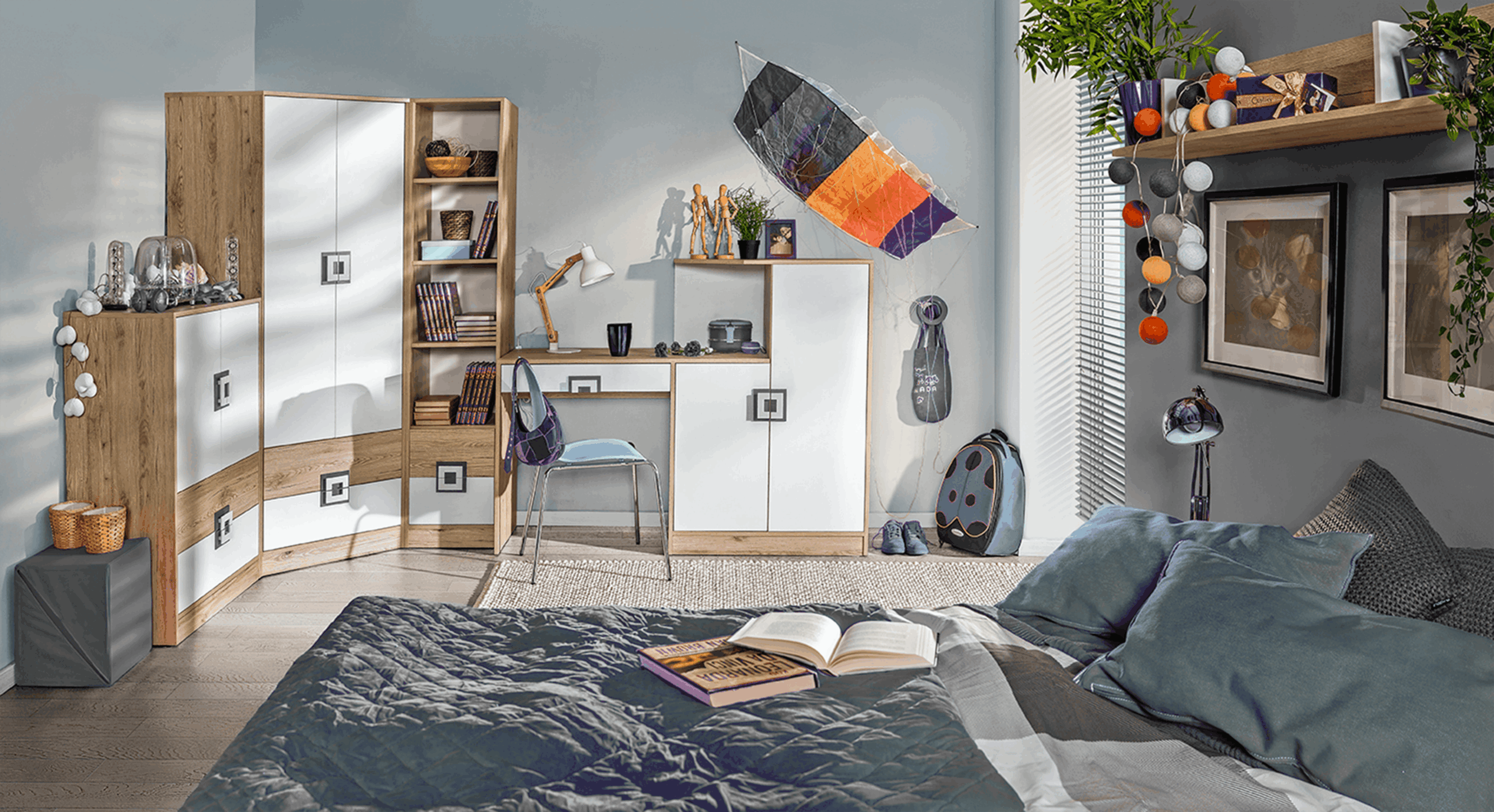 Kolekcja mebli Vamex to nowoczesne, młodzieżowe rozwiązanie w kolorach jasnego dębu, różu, szarości, turkusu i bieli, idealnie sprawdzające się w pokoju sypialnianym. Dzięki uniwersalnemu designowi, meble z tej kolekcji wprowadzą do wnętrza świeżość i styl, a ich funkcjonalność sprawia, że równie dobrze prezentują się także w innych pomieszczeniach.