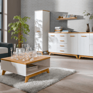 System meblowy Zink to esencja skandynawskiego designu, łącząca minimalistyczną estetykę z praktycznymi rozwiązaniami. Meble wyróżniają się prostymi frontami w odcieniu sosny andersen oraz akcentami imitującymi drewno, które doskonale wpisują się w nowoczesne trendy wnętrzarskie.