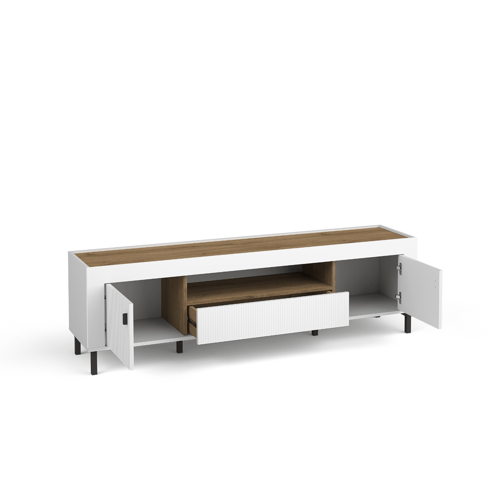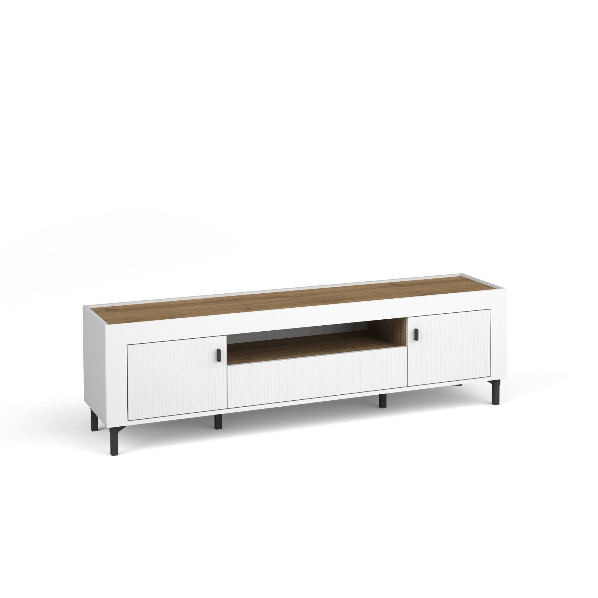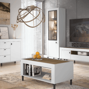 Kolekcja Naro to nowoczesna linia mebli, która wyróżnia się eleganckim designem i wysoką funkcjonalnością, idealnie pasującą do salonu, pokoju dziennego czy sypialni. Charakterystycznym elementem tej kolekcji są wysokie nóżki, gustowne uchwyty oraz proste, masywne bryły dostępne w kolorze bieli, czerni i kaszmiru, wzbogacone o akcenty w odcieniu dębu wiskey. Efekt 3D, nadawany przez prążkowane fronty, podkreśla nowoczesność i styl mebli. Bogaty wybór elementów, takich jak komody, witryny, szafy, regały, ławy, stoliki nocne oraz szafki RTV, pozwala na indywidualne aranżacje wnętrz, dostosowane do potrzeb każdego pomieszczenia.