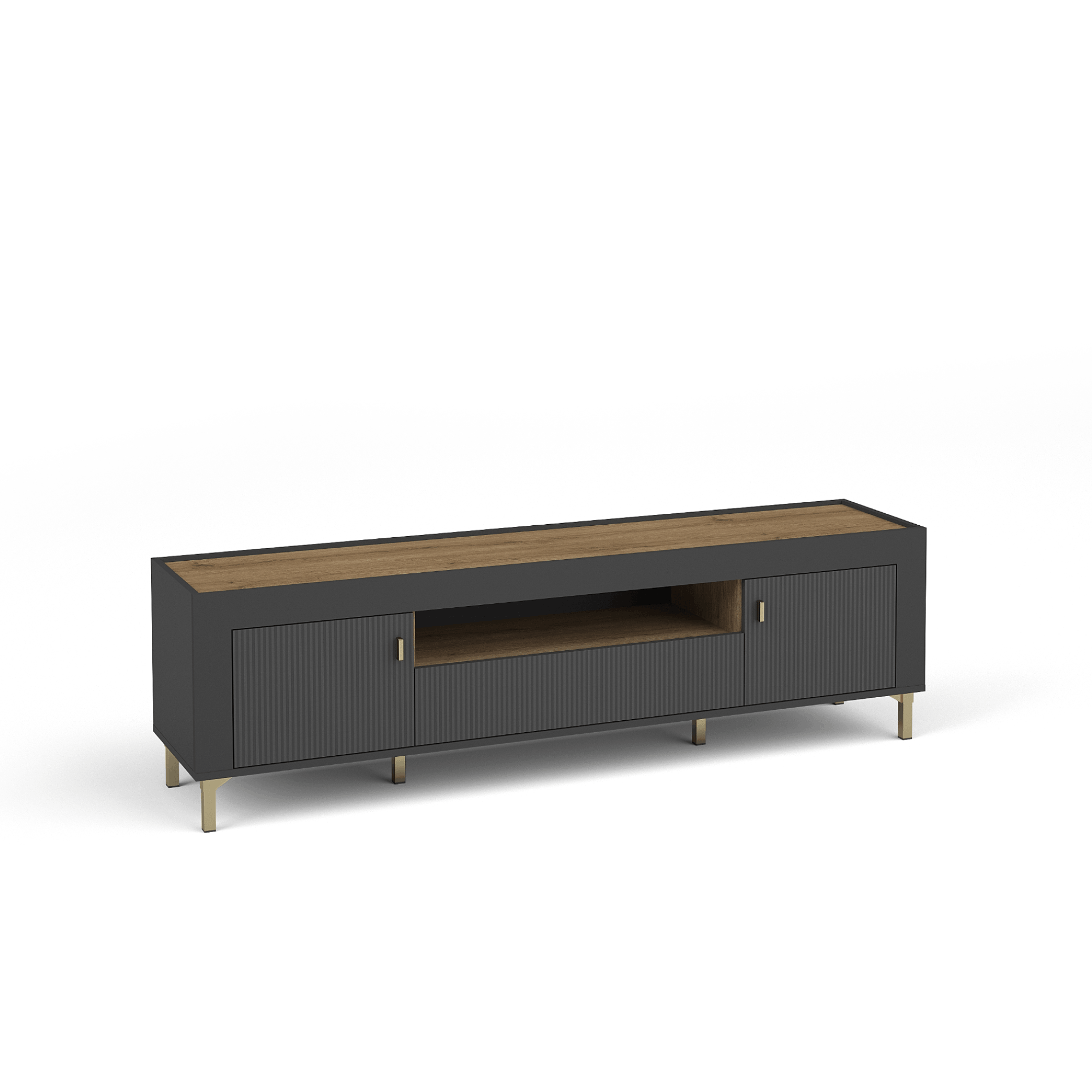Kolekcja Naro to nowoczesna linia mebli, która wyróżnia się eleganckim designem i wysoką funkcjonalnością, idealnie pasującą do salonu, pokoju dziennego czy sypialni. Charakterystycznym elementem tej kolekcji są wysokie nóżki, gustowne uchwyty oraz proste, masywne bryły dostępne w kolorze bieli, czerni i kaszmiru, wzbogacone o akcenty w odcieniu dębu wiskey. Efekt 3D, nadawany przez prążkowane fronty, podkreśla nowoczesność i styl mebli. Bogaty wybór elementów, takich jak komody, witryny, szafy, regały, ławy, stoliki nocne oraz szafki RTV, pozwala na indywidualne aranżacje wnętrz, dostosowane do potrzeb każdego pomieszczenia.