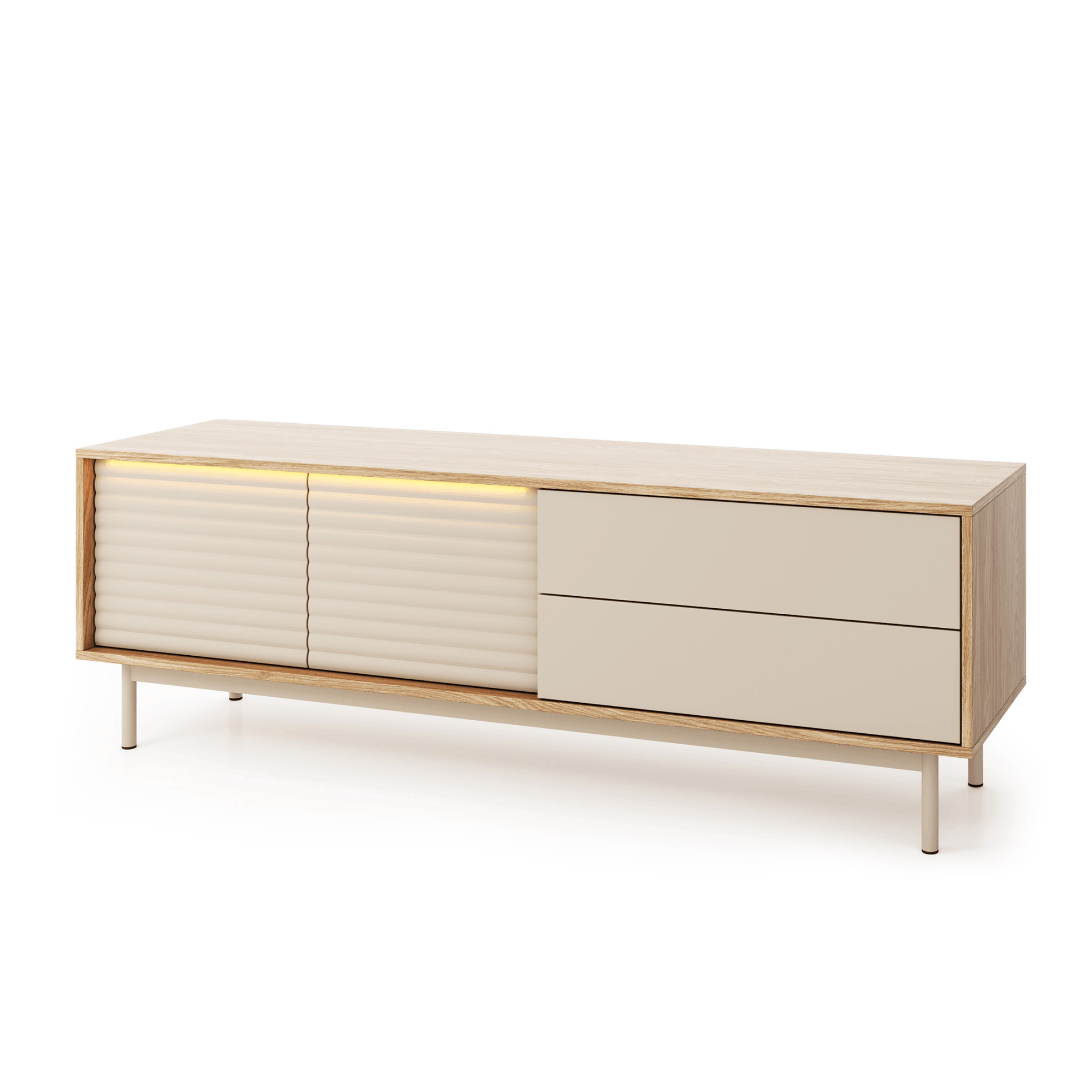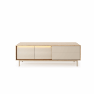 Minimalistyczna forma mebli została podkreślona przez bezuchwytowy system otwierania oraz smukłe metalowe nóżki, które dodają bryłom lekkości. Dodatkowym atutem kolekcji jest oświetlenie LED podkreślające ryflowaną część frontów, które tworzy elegancki efekt wizualny i wprowadza przyjemny klimat do wnętrza.